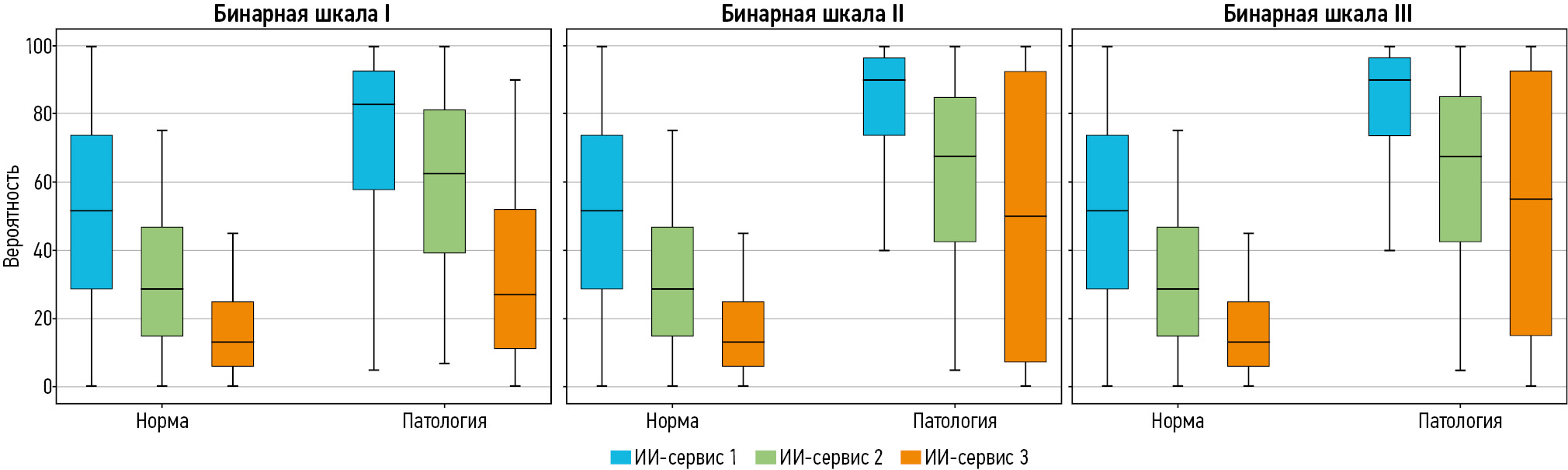 The study assessed three AI services: TrioDM-MT® (Medical Technologies Ltd., Russia) (AUC 0.90; specificity 0.85; sensitivity 0.83; accuracy 0.84); Celsus® (Medical Screening Systems LLC, Russia) (AUC 0.96); and Lunit INSIGHT MMG® (Lunit Inc., Republic of Korea) (AUC 0.96; sensitivity 0.89 when assessed together with a radiologist) [2–4]. The AI service results for every mammography test were displayed as probabilities, with 0% denoting a low likelihood of cancer and 100% denoting a high probability of cancer. The trade names of the AI services are anonymized and randomized further in the text.