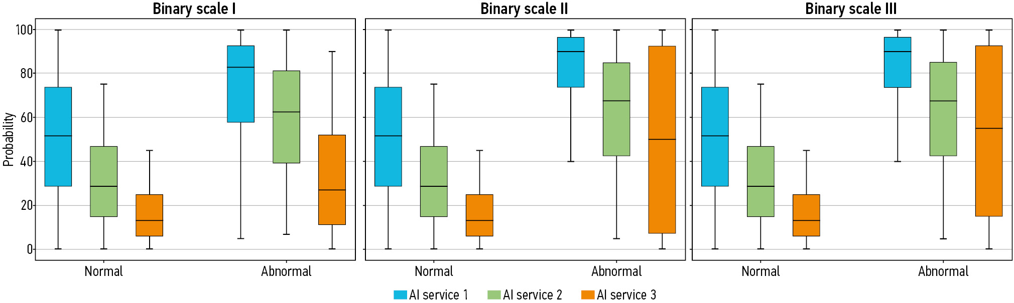 This study discovered that the method for developing a “normal/abnormal” binary scale affects the diagnostic accuracy parameters of various types and versions of AI services. Significant discrepancies between the accuracy parameters of AI services and diagnostic scales were identified by Youden’s index, and the clinical setting determines which parameters should be utilized in the comparative evaluation of AI services. Using Youden’s index maximization to set up an AI service provides a balance of sensitivity and specificity that is not necessarily clinically significant.