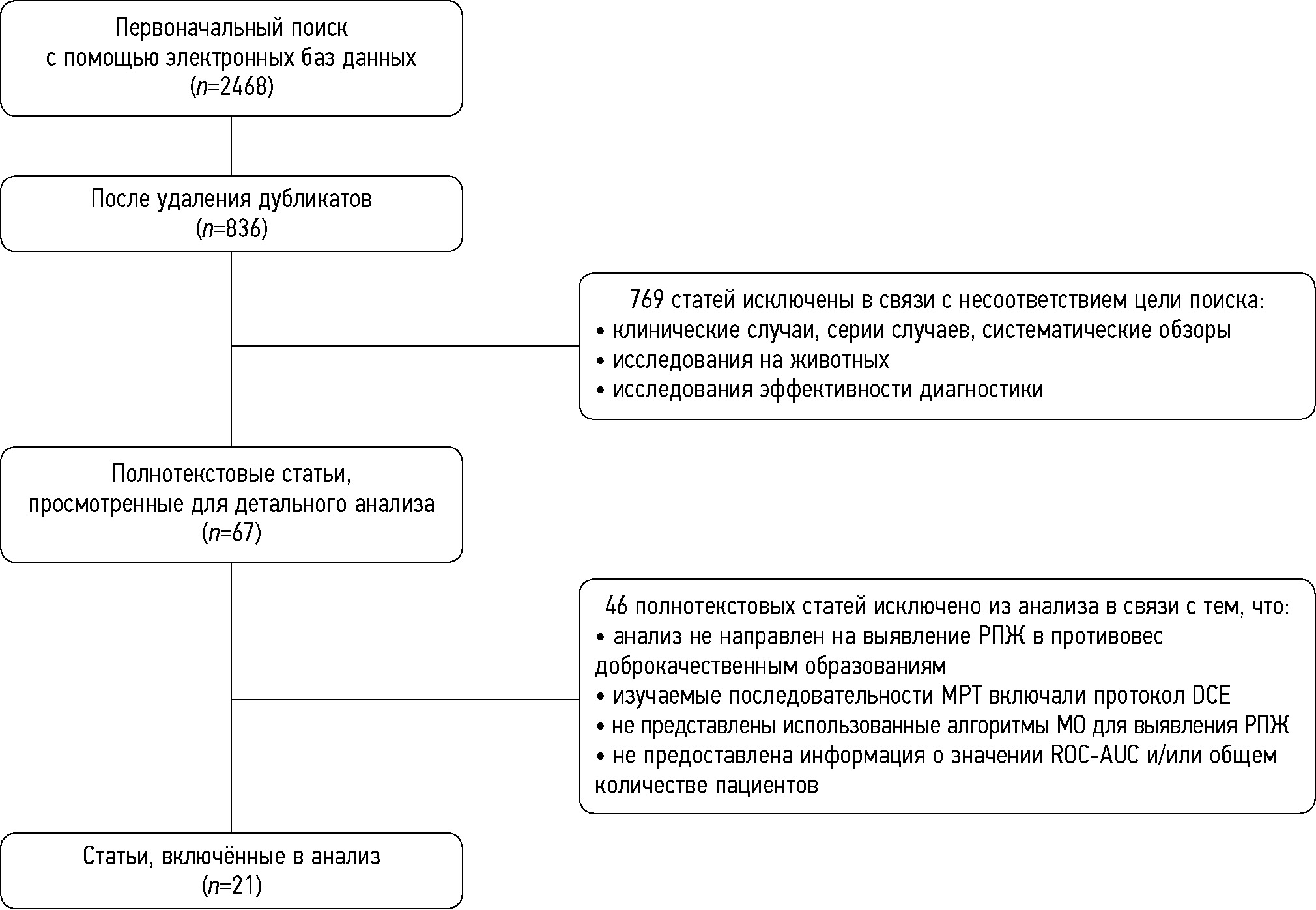 Согласно поставленной цели поиска, в исследование были включены оригинальные статьи и полный текст на русском или английском языках. Монографии, обзоры, метаанализы, описания отдельных случаев, мнения экспертов, исследования, результаты которых опубликованы только в форме тезисов, а также исследования на животных или исследования эффективности диагностики были исключены из анализа. Кроме того, из раздела скрининга были исключены статьи, в которых недостаточно внимания уделялось реализации алгоритмов МО, исследованию РПЖ и результатам моделирования. Следует подчеркнуть, что количество включённых в исследования пациентов не являлось для нас определяющим фактором отбора.