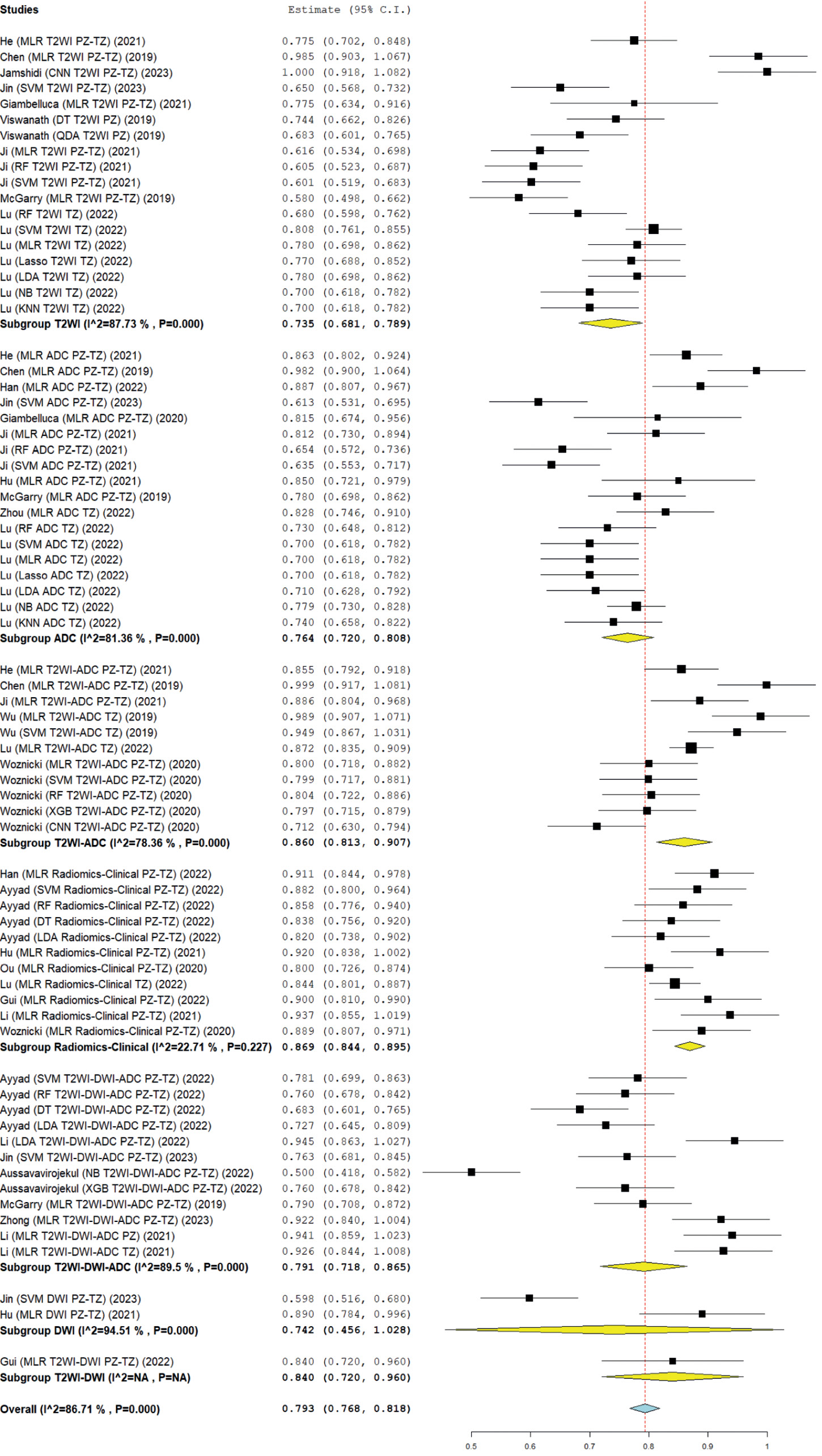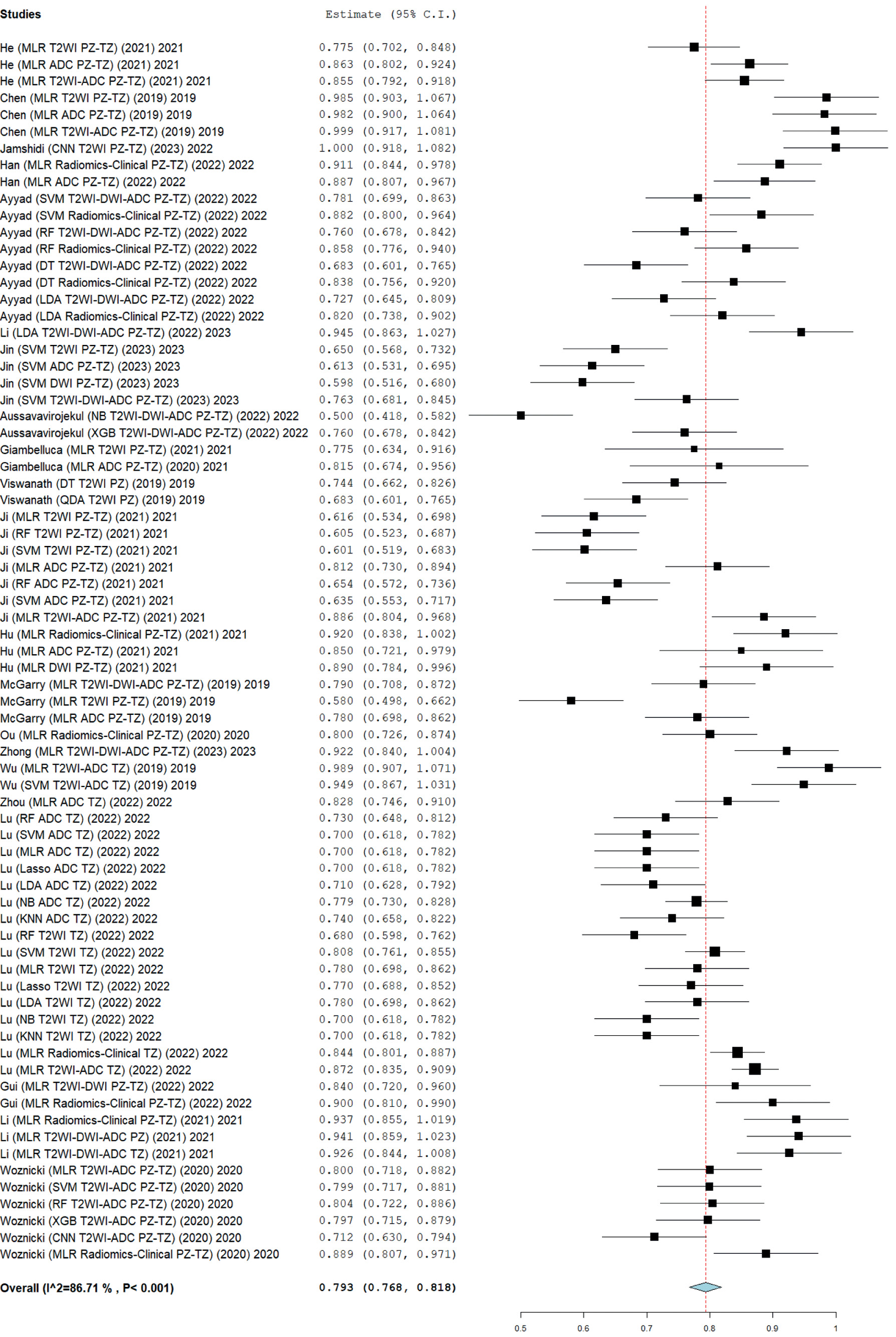 RESULTS: This systematic review meta-analysis included 21 studies. In total, data from 3,630 patients were analyzed, of which 47% had prostate cancer and 53% had benign prostate neoplasms. The mean age of the patients was 67.1 (36–90) years. In addition, 81% of the studies were based on T2-weighted imaging, 57% on diffusion-weighted imaging, and 76% on apparent diffusion coefficient. Moreover, 43% and 33% of the studies were dedicated to transition zone and prostate peripheral zone neoplasms, respectively, and 52% of the authors examined the whole prostate gland, without dividing it into zones. The most common machine-learning algorithms applied by the investigators were as follows: multiple logistic regression (76%), support vector machine (38%), and random forest (24%). Based on the meta-analysis performed for the receiver operating characteristic-area under the curve (ROC–AUC) assessment with random-effect approach in 73 prediction models described in the publications, the final ROC–AUC was 0.793 [95% CI 0.768–0.818], I2 = 86.71%, p <0.001. The most accurate prediction models were based on the T2-weighted imaging + apparent diffusion coefficients imaging protocol: 0.860 [95% CI 0.813–0.907], and models created according to the “white box” principle (0.834 [95% CI 0.806–0.861]) were more accurate than the “black box” ones (0.733 [95% CI 0.695–0.771]). The models using radiomics and clinical features were slightly more accurate than those using the radiomics parameters alone (0.869 [95% CI 0.844–0.895] vs. 0.779 [95% CI 0.751–0.807]). Model accuracy was nearly identical across transitional and/or peripheral zone studies.