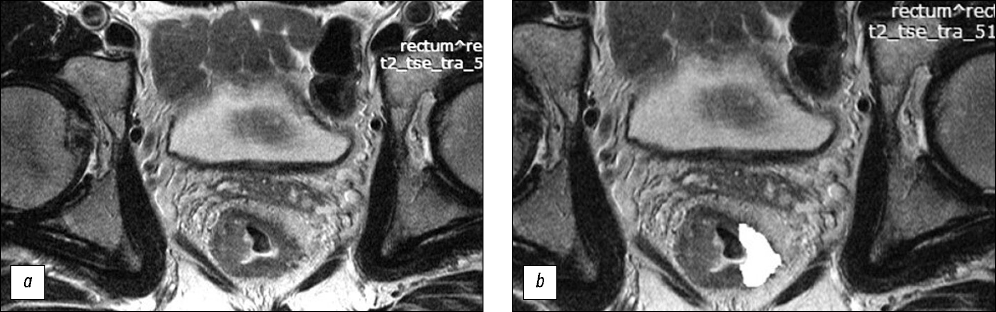 Рис. 1. Магнитно-резонансная томография малого таза, T2-ВИ, косо-аксиальный срез, опухоль нижнеампулярного отдела прямой кишки: a ― до неоадъювантной химиолучевой терапии; b ― после сегментации (белым цветом выделена область для автоматического расчёта параметров текстуры).
