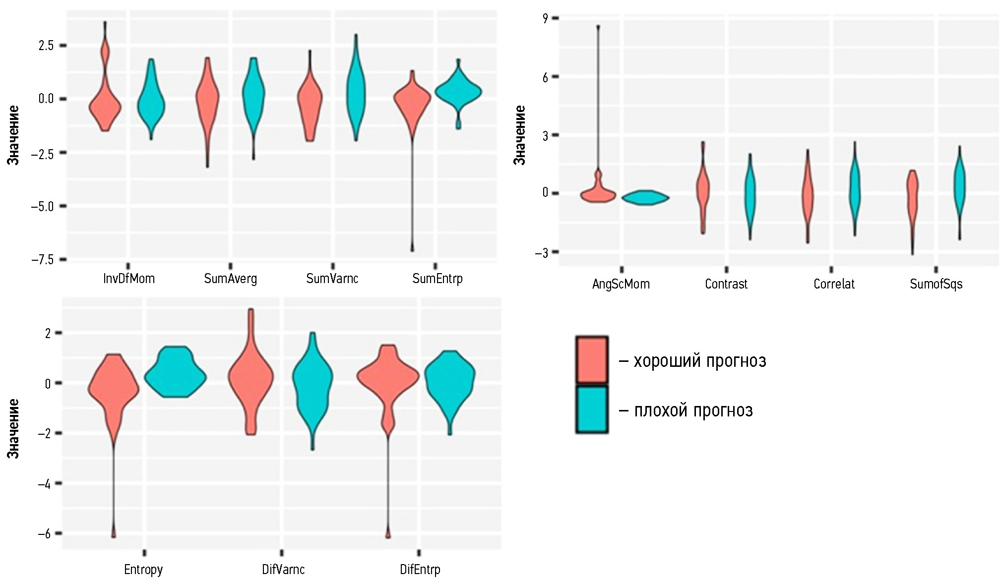 Рис. 2. Распределение количественных значений параметров текстурного анализа местнораспространённого рака прямой кишки в группах пациентов с хорошим и плохим прогнозом на неоадъювантную химиолучевую терапию в обучающей выборке.