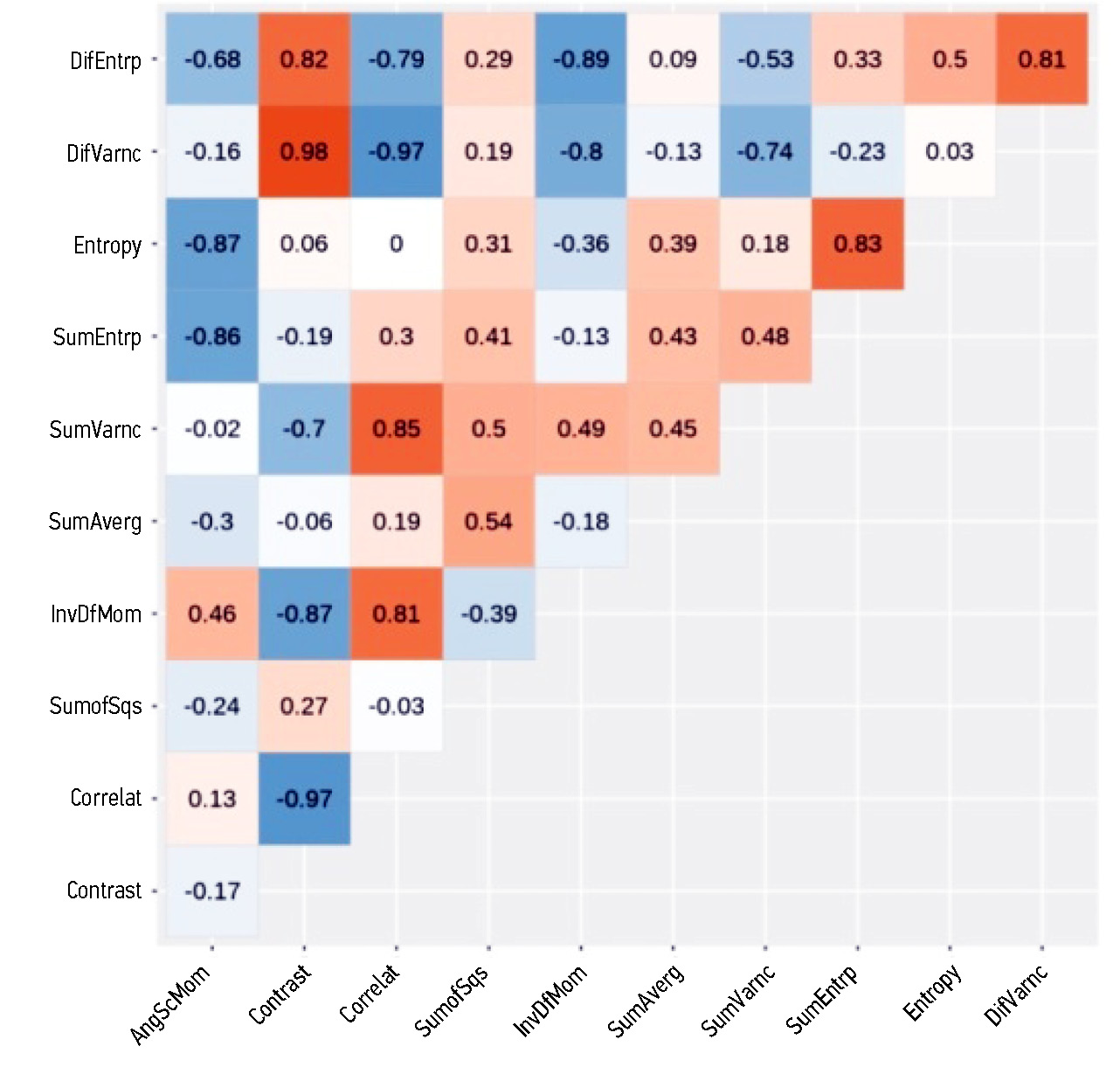Рис. 3. Корреляция между параметрами текстурного анализа в обучающей выборке. Градацией оранжевого цвета обозначена сила прямой корреляционной связи, градацией синего ― сила обратной корреляционной связи (более интенсивный цвет соответствует большей силе связи).