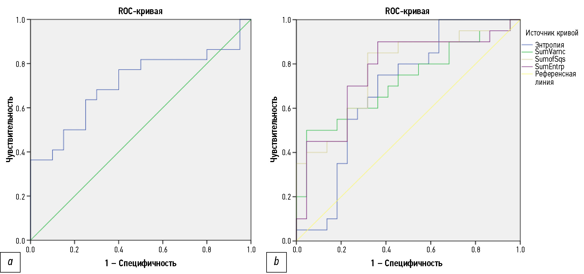 Рис. 4. ROC-кривые для параметров текстурного анализа в обучающей выборке: a ― для AngScMom; b ― для Entropy, SumEntrp, SumofSqs, SumVarnc.