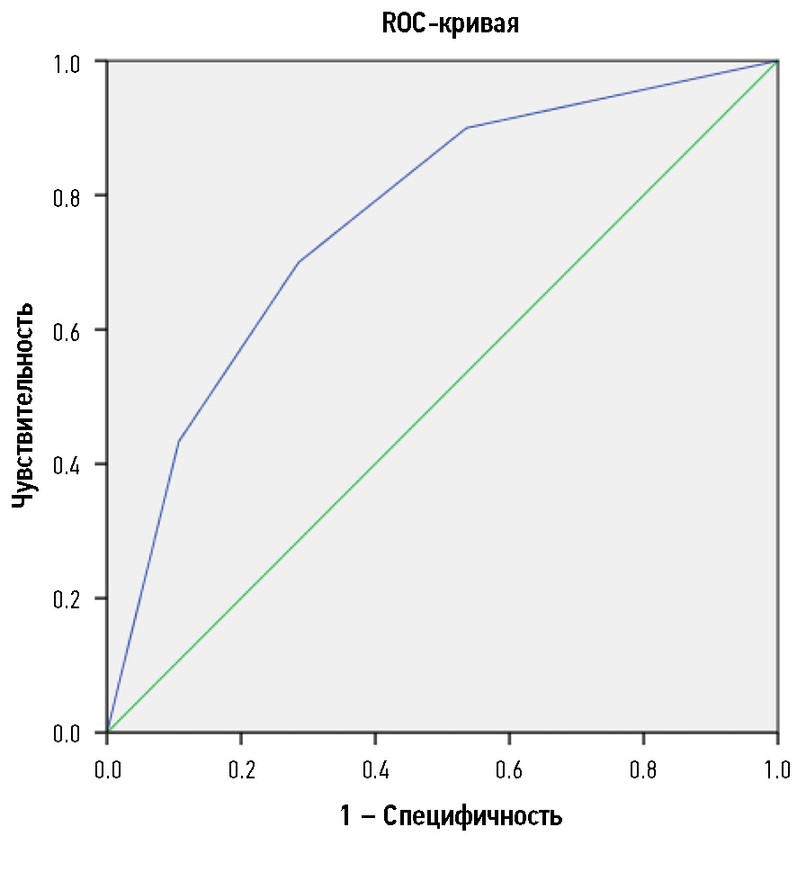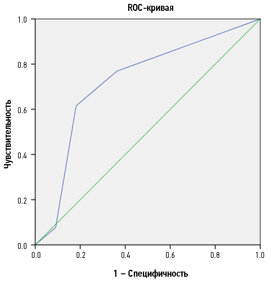 Для прогнозирования ответа на неоадъювантную химиолучевую терапию система балльной оценки параметров текстурного анализа показала умеренную диагностическую эффективность c AUC 0,76 (рис. 5). Оптимальный результат отбора пациентов с хорошим прогнозом достигался при сумме баллов ≥2. Результаты прогнозирования ответа в обучающей выборке представлены в табл. 4; параметры диагностической эффективности, рассчитанные на их основе, ― в табл. 5. Полученные результаты свидетельствуют об умеренных диагностических возможностях разработанной балльной системы прогнозирования ответа опухоли на основе параметров текстурного анализа первичного Т2-ВИ.