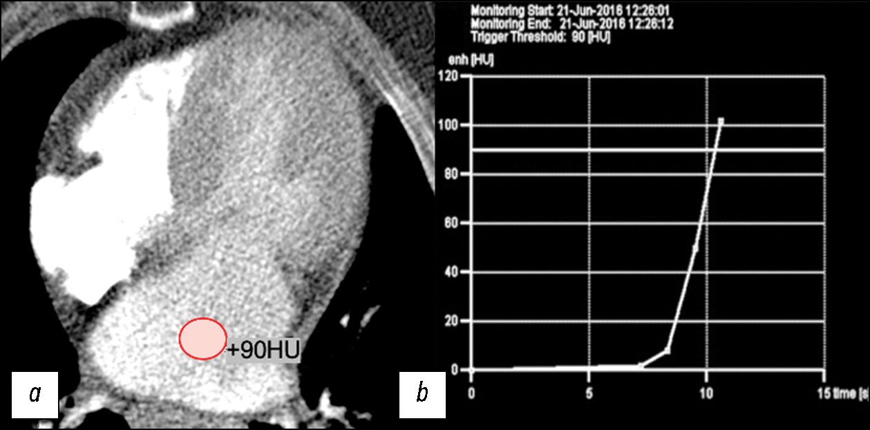 Рис. 1. Изображение компьютерной томографии премониторинга и графика мониторинга: a — установка автоматического мониторинга болюса контрастного препарата в полости левого предсердия c пороговым значением болюса 90 HU; b — пример графика мониторинга болюса контрастного препарата.