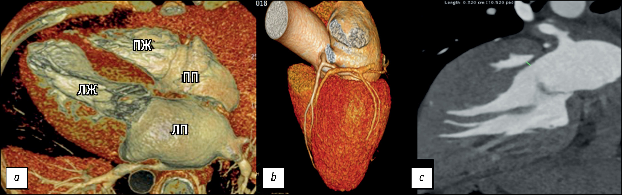 Рис. 2. Пример пост-процессорной обработки изображений компьютерной ангиографии сердца пациента с гипертрофической кардиомиопатией. Визуализации полостей сердца, коронарных артерий и головок папиллярных мышц: a — 3D-реконструкция четырёхкамерной проекции сердца; b — 3D-реконструкция коронарных артерий; c — мультипланарная реконструкция в двухкамерной проекции сердца. ЛП — левое предсердие, ЛЖ — левый желудочек, ПП — правое предсердие, ПЖ — правый желудочек.