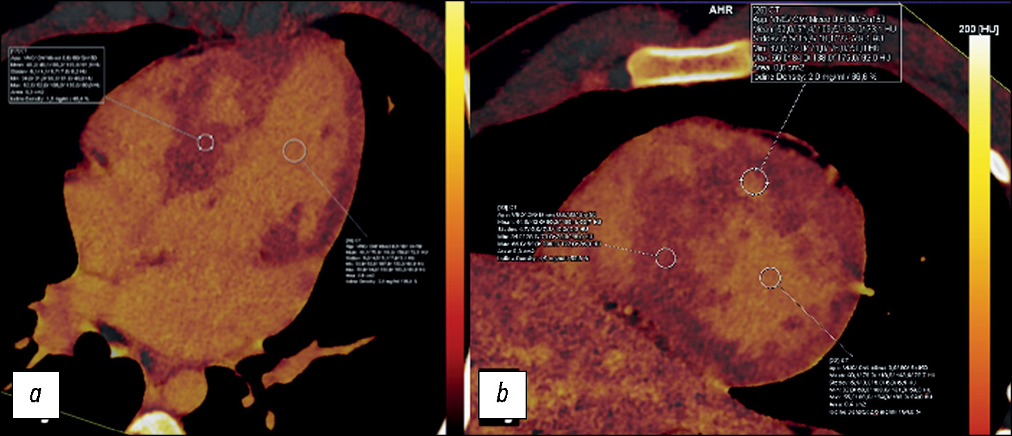 Рис. 3. Йодные карты двухэнергетической компьютерной томографии: a — четырёхкамерная проекция сердца (ROI — измерение распределения йода в полости левого желудочка и межжелудочковой перегородке); b — короткая ось сердца (ROI — измерение распределения йода в полости левого желудочка и по межжелудочковой перегородке).