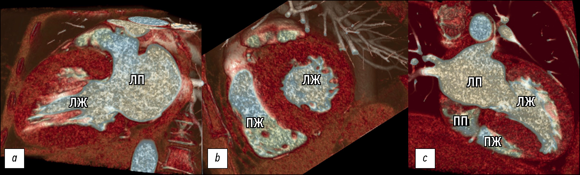 Рис. 4. Пример 3D-изображений компьютерной томографии диффузно-септального фенотипа ГКМП: a — плоскость двухкамерной проекции левых отделов сердца; b — короткая ось сердца; c — четырёхкамерная проекция сердца. ЛЖ — левый желудочек, ЛП — левое предсердие, ПЖ — правый желудочек, ПП — правое предсердие.