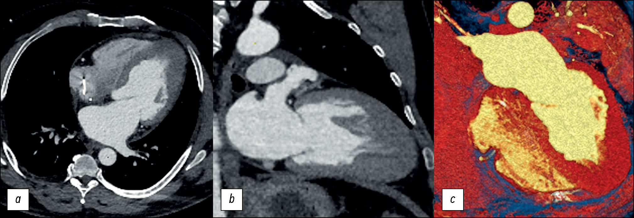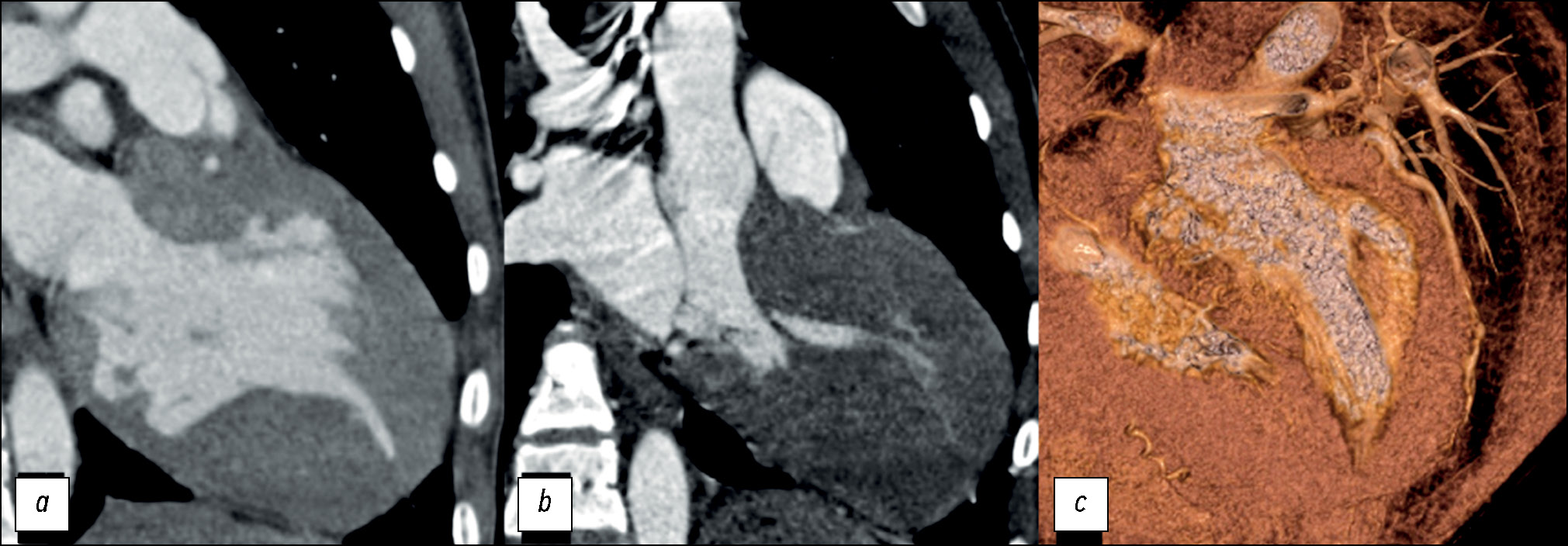 Рис. 7. Пример MPR и 3D-изображений компьютерной томографии пациента с апикальным фенотипом гипертрофической кардио-миопатии после имплантации кардиовертер-дефибриллятора: a — плоскость четырёхкамерной проекции; b — двухкамерная проекция левых отделов сердца; c — 3D VRT реконструкции четырёхкамерной проекции сердца.