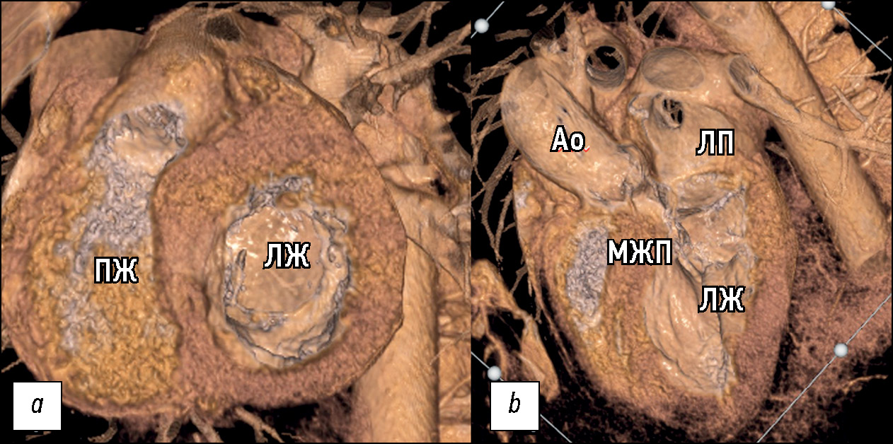 Рис. 6. Пример 3D-изображений компьютерной томографии фокально-базального фенотипа гипертрофической кардиомиопатии: a — плоскость двухкамерной проекции левых отделов сердца; b — короткая ось сердца. ЛЖ — левый желудочек; ЛП — левое предсердие; ПЖ — правый желудочек; МЖП — межжелудочковая перегородка; Ао — аорта.