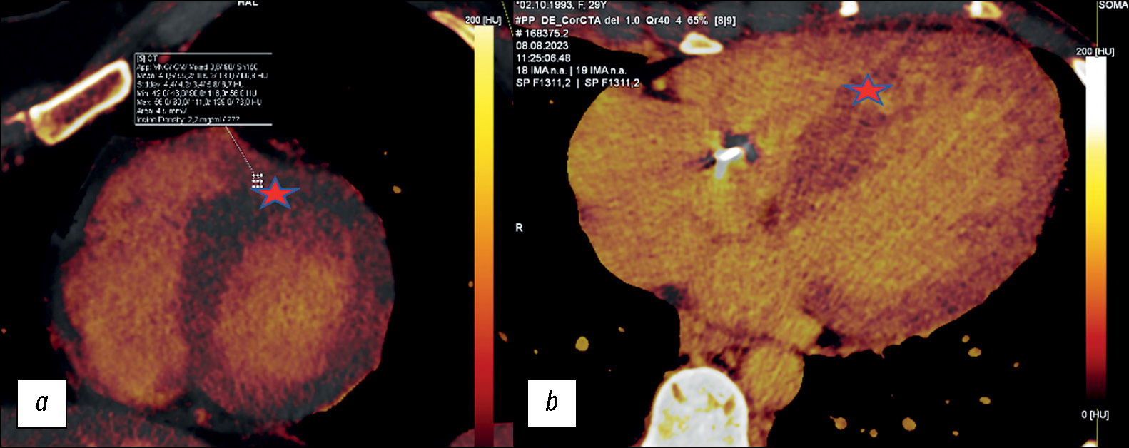 Оценка структурных изменений миокарда методом ДЭКТ выполнена 13 (27%) пациентам. У всех пациентов выявлены очаговые накопления йода на картах отсроченного контрастирования (рис. 8).