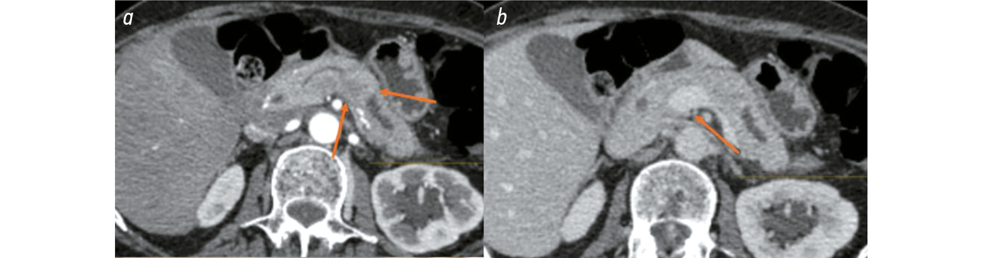 Fig. 2. Computed tomography of a hypovascular pancreatic neuroendocrine tumor: a, a moderately hypervascular lesion in the pancreatic body with a hypodense central area and dilatation of the pancreatic duct, arterial phase (10th second); b, moderate compression of the splenic vein, venous phase.