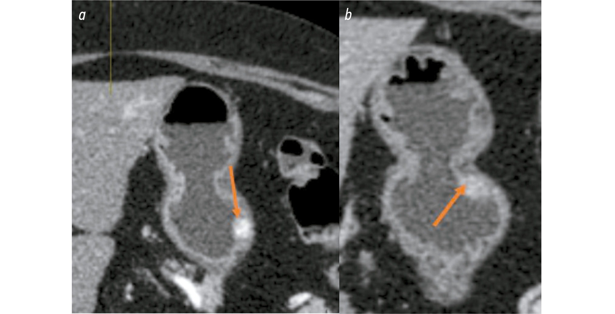Fig. 4. Gastric neuroendocrine tumor: a, low contrast uptake by tumor tissue, arterial phase; b, a hyperintense lesion in the upper wall of the gastric cardia (up to 6 mm), venous phase.