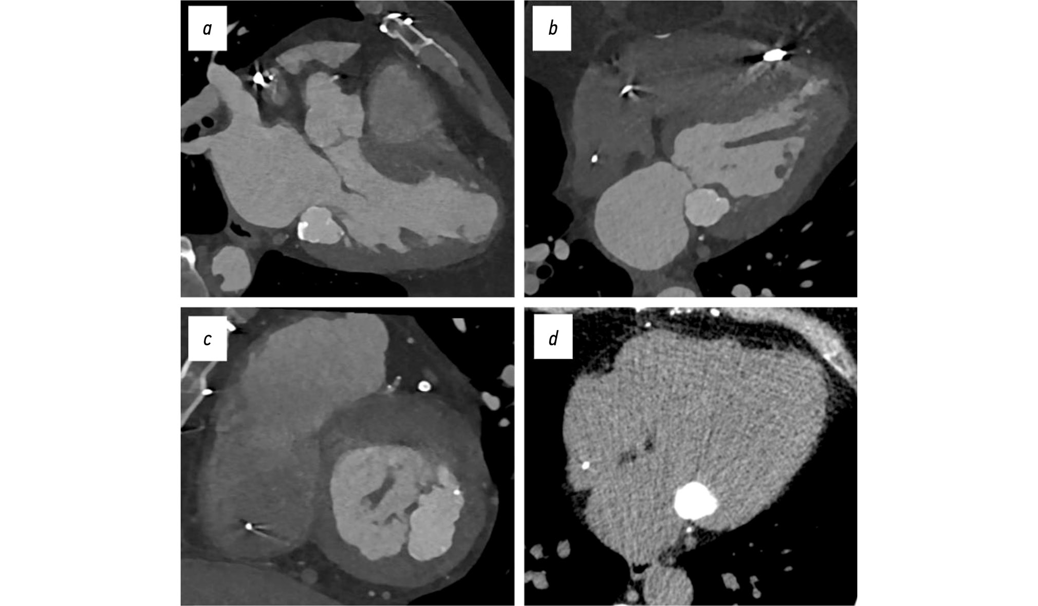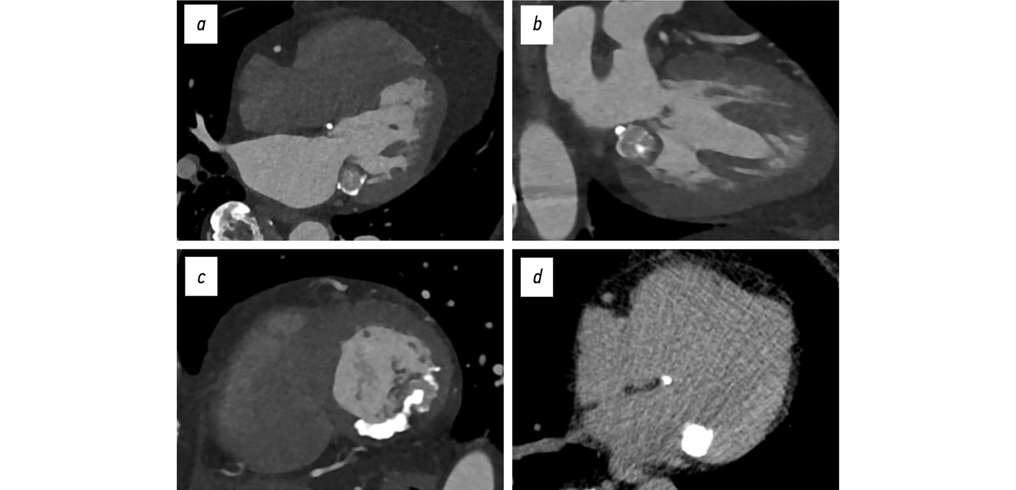 Fig. 2. ECG-gated cardiac computed tomography, clinical case 1: a–c, contrast-enhanced images, bone window; d, non-contrast image, soft tissue window; findings consistent with caseous subvalvular calcification beneath the posterior mitral leaflet: a, three-chamber view; b, four-chamber view; c, short-axis view at the mitral valve level; d, axial view.