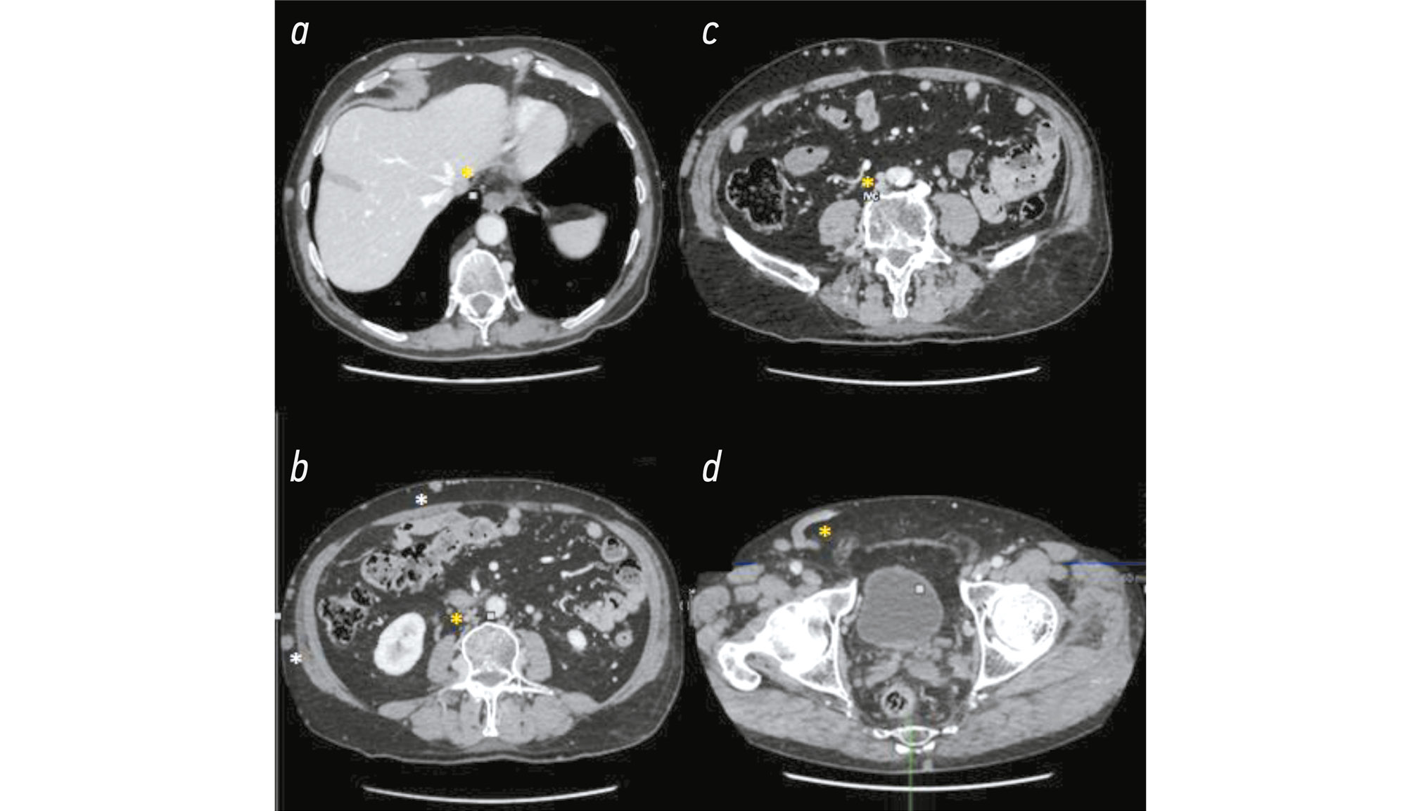 Fig. 1. Computed tomography images of the axial section of the abdomen (portal phase): a) The small suprarenal IVC is indicated by a yellow asterisk. b) Lower in the abdomen, the yellow asterisk indicates the hypoplastic IVC, and the hypertrophic collateral venous circles in the anterior abdomen wall on the right are indicated by a white asterisk. c) Another lower axial section showing the small IVC (yellow asterisk). d) The drainage on the right side is accomplished by a constant iliac vessel (yellow asterisk).