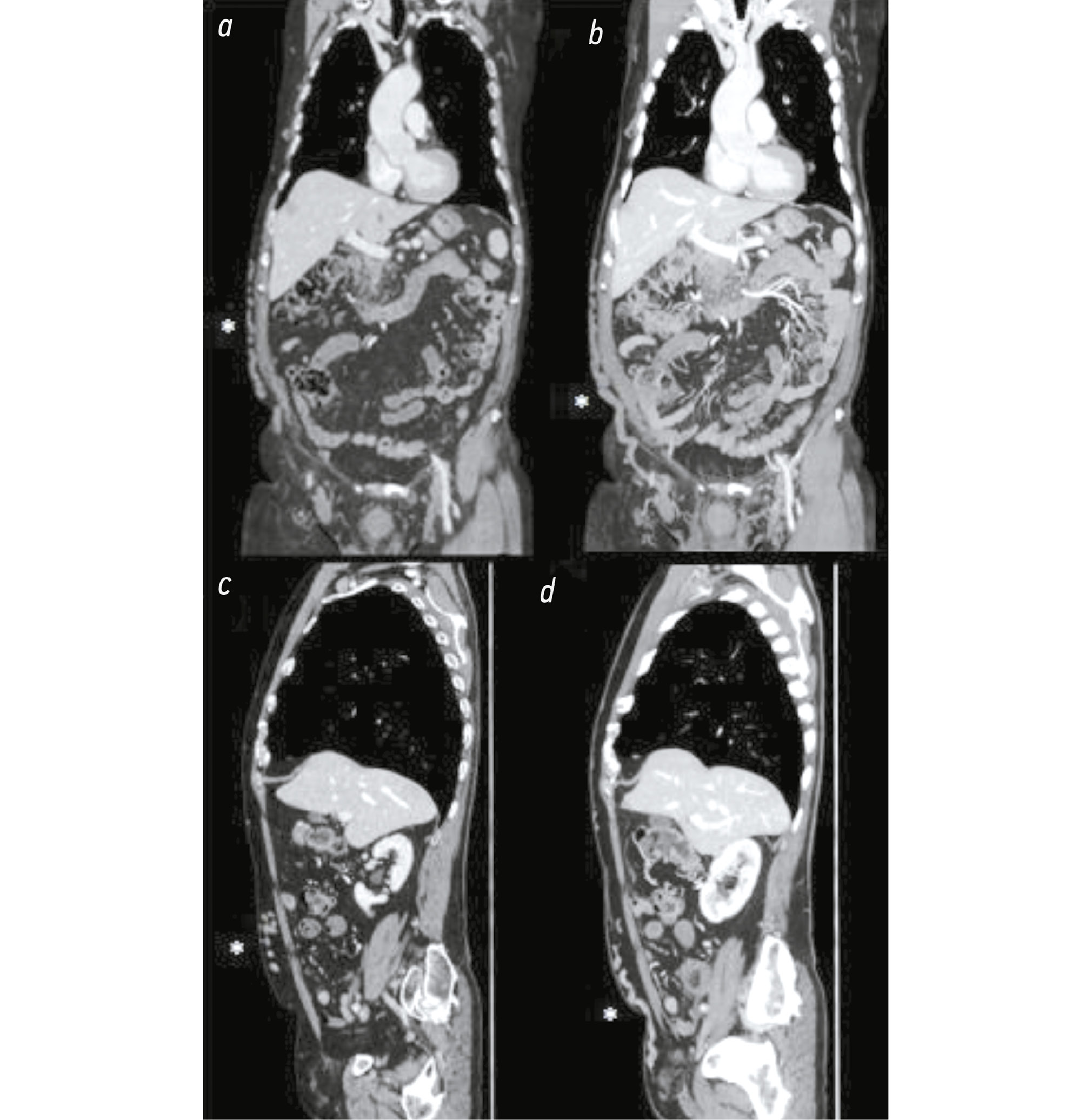 Fig. 2. Computed tomography images of the coronal (up) and sagittal (down) sections in the portal phase of the chest and abdomen: a) Right abdominal wall: consistent venous collateral circles are visible (white asterisk). b) The same image with a rising MIP value indicates venous collateral rings, particularly on the patient’s right side. c) and d) Hypertrophic venous collateral circles in the sagittal section at different levels.
