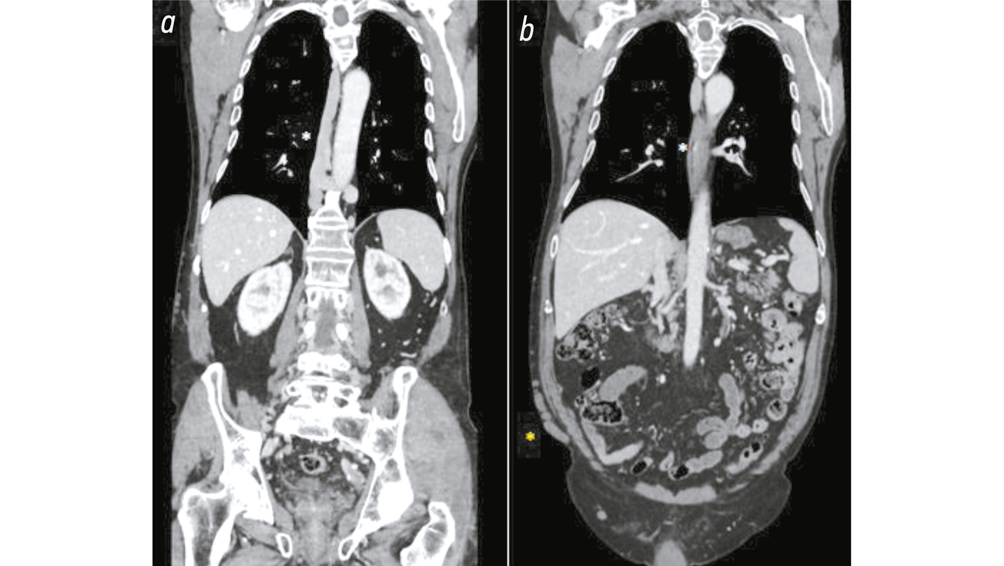 Fig. 3. Computed tomography images of the coronal section and portal phase of the chest and abdomen: a) The white asterisk indicates the confluence of the giant azygos, hemiazygos, and an aberrant vein. b) Same image at different sections. The yellow asterisk on the right side at the level of the anterior abdominal wall indicates marked collateral vein circles.