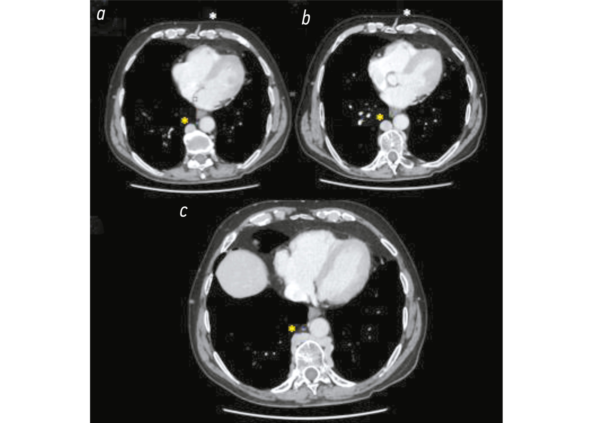 Fig. 4. Computed tomography images of the axial section of the chest: the confluence with the hypertrophic azygos and hemiazygos veins is seen in all images at different levels (from upper to lower). In a) and b), the white asterisk marks the confluence of the collateral circles of the abdomen and chest.