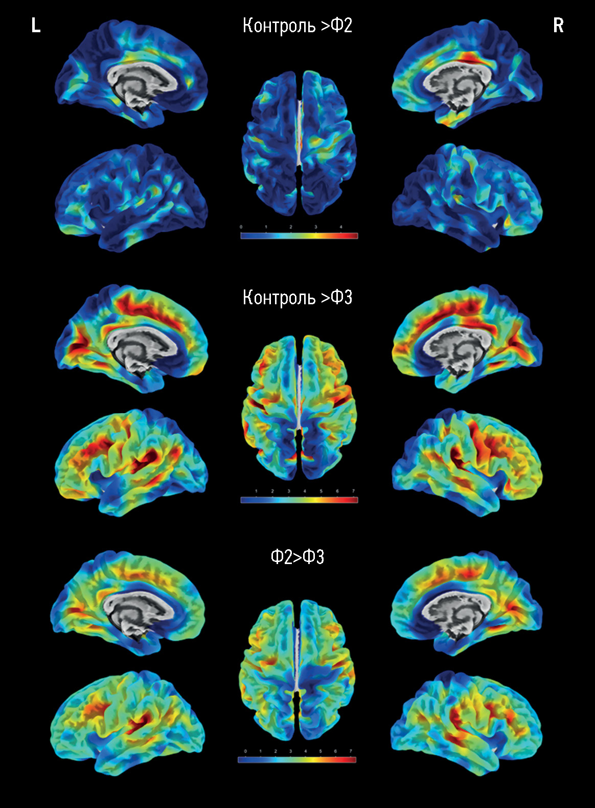 Рис. 1. Визуальное отображение результатов поверхностной морфометрии после статистического анализа изображений групп контроля и Фазекас 2 (первый ряд, Ф2), контроля и Фазекас 3 (средний ряд, Ф3), Фазекас 2 и Фазекас 3 (нижний ряд) в программе CAT12 с выделением красно-жёлтой градации цвета (согласно шкале) регионов со значимо большими различиями толщины коры между группами (FWE, pcorr <0,05). L ― левое полушарие, R ― правое полушарие.