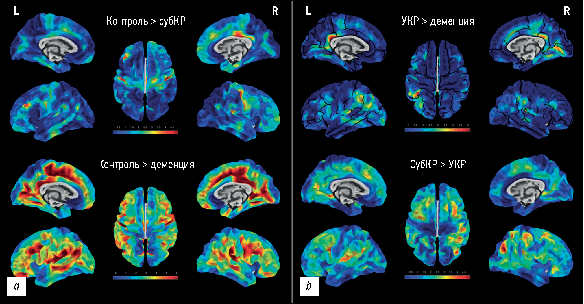 Рис. 2. Результаты поверхностной морфометрии: a ― сравнение толщины коры между пациентами групп контроля и субъективных когнитивных расстройств (субКР) и деменции; b ― внутри группы церебральной микроангиопатии ― между умеренными когнитивными расстройствами (УКР) и деменцией, субъективными (субКР) и умеренными (УКР) когнитивными расстройствами. Жёлто-красным цветом закодированы регионы, где толщина коры достоверно больше для группы контроля (a), умеренных когнитивных расстройств по сравнению с деменцией (b, вверху) и субъективных когнитивных расстройств по сравнению с умеренными (b, внизу) соответственно (FWE, pcorr <0,05). L ― левое полушарие; R ― правое полушарие большого мозга.