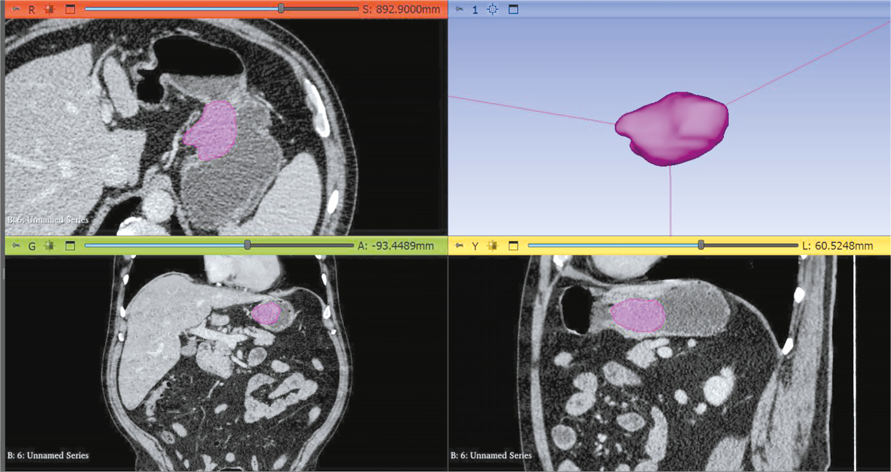 Рис. 1. Пример сегментации опухоли с использованием программного обеспечения для текстурного анализа (Slicer 3D): результат компьютерной томографии в венозную фазу сканирования у пациента с гастроинтестинальной стромальной опухолью желудка.