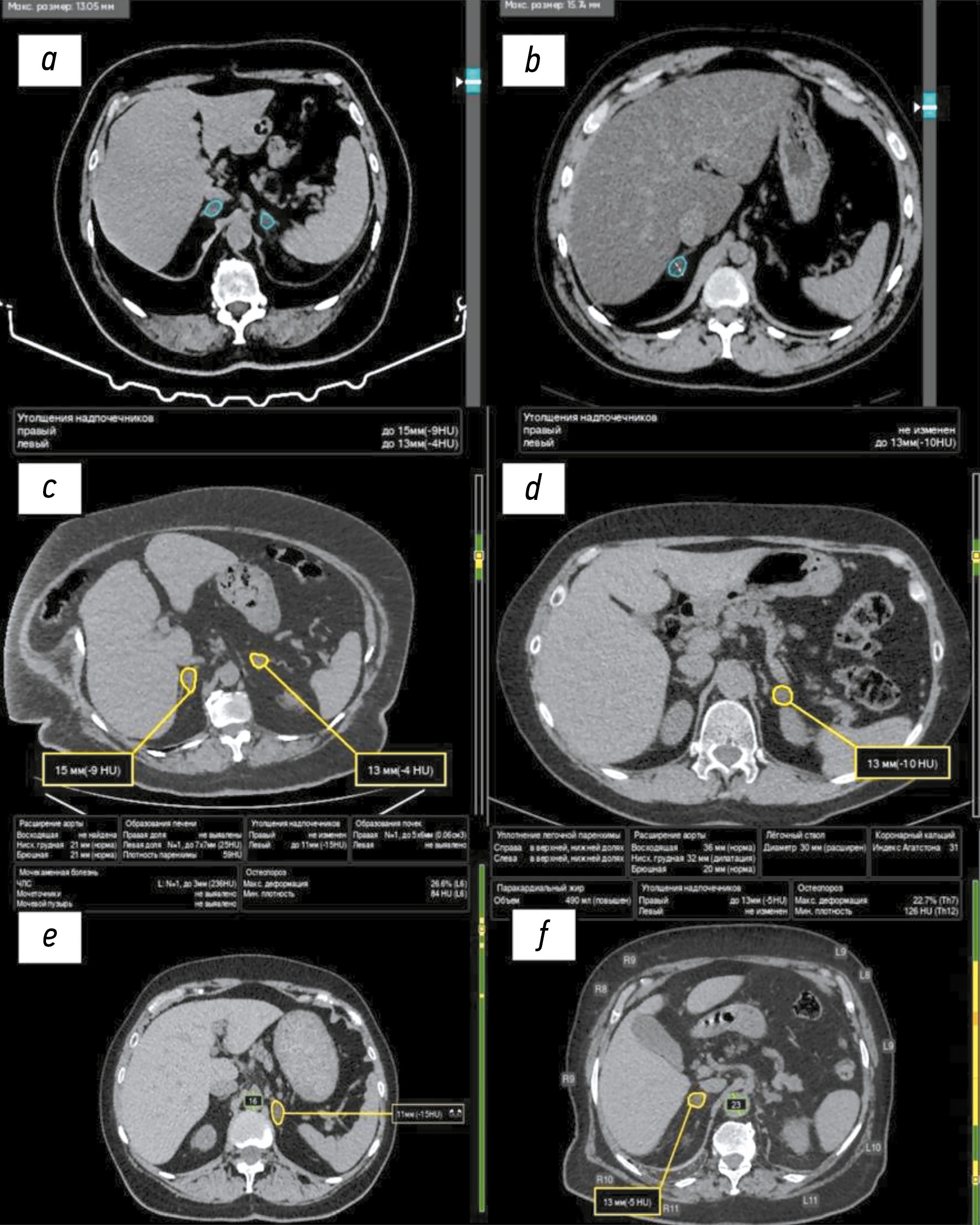 Рис. 1. Примеры работы сервисов искусственного интеллекта для выявления новообразований надпочечников по данным компьютерной томографии органов грудной клетки и брюшной полости: a, b — моносервис на основе искусственного интеллекта-1 для диагностики новообразований надпочечников: голубым контуром обведены новообразования надпочечников на изображениях компьютерной томографии органов брюшной полости; c, d — моносервис на основе искусственного интеллекта-2 для диагностики новообразований надпочечников: жёлтым контуром обведены новообразования надпочечников на изображениях компьютерной томографии органов брюшной полости; e, f — комплексный сервис на основе искусственного интеллекта-2 для диагностики новообразований надпочечников: жёлтым контуром обведено образование левого надпочечника (e) на изображении компьютерной томографии органов брюшной полости и правого надпочечника (f) на изображении компьютерной томографии органов грудной клетки.