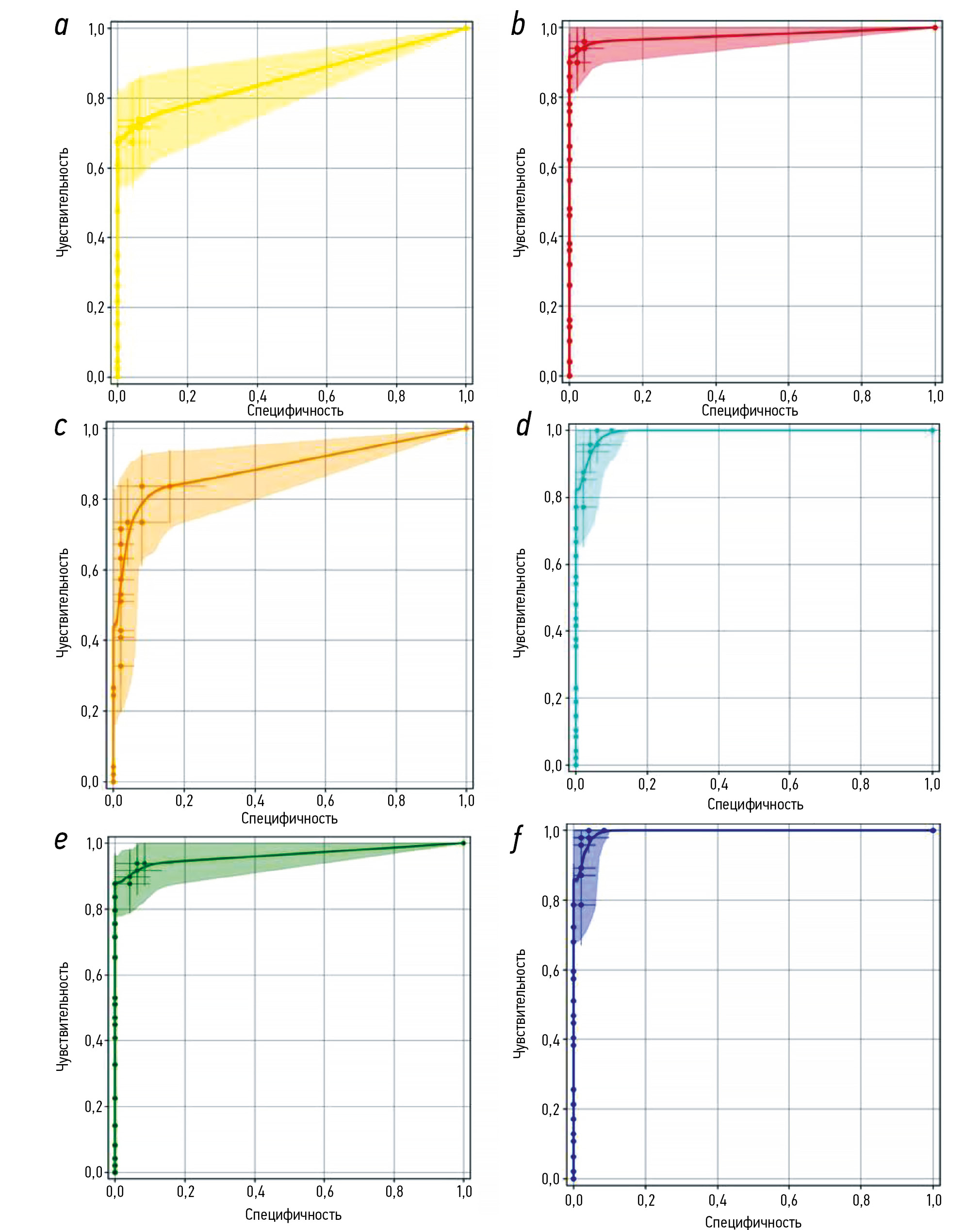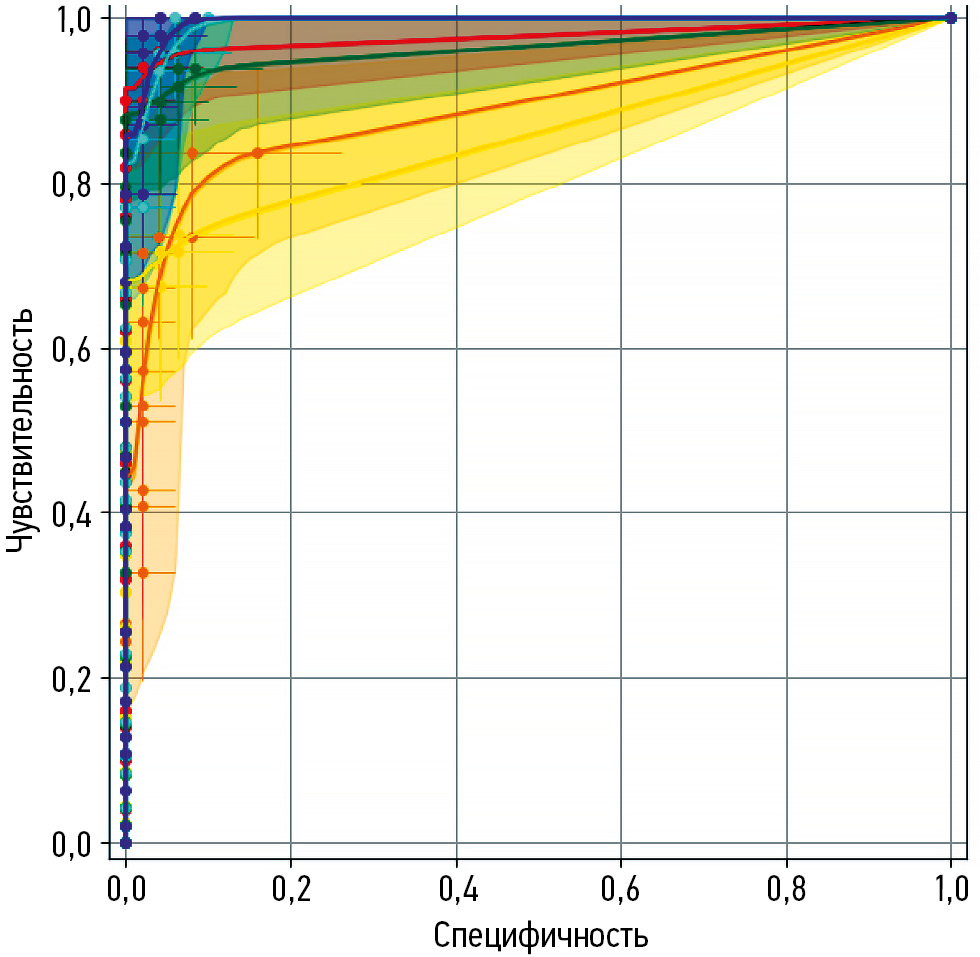 Общие метрики ИИ-сервисов, представленные в результатах, рассчитаны с 95% доверительным интервалом. Сравнение и расчёт p проводили с помощью функции roc.test языка R (method="delong"). Проверяли нулевую гипотезу об отсутствии статистически значимых различий между программными обеспечениями на основе технологий искусственного интеллекта. Уровень статистической значимости p=0,05 (двусторонний).