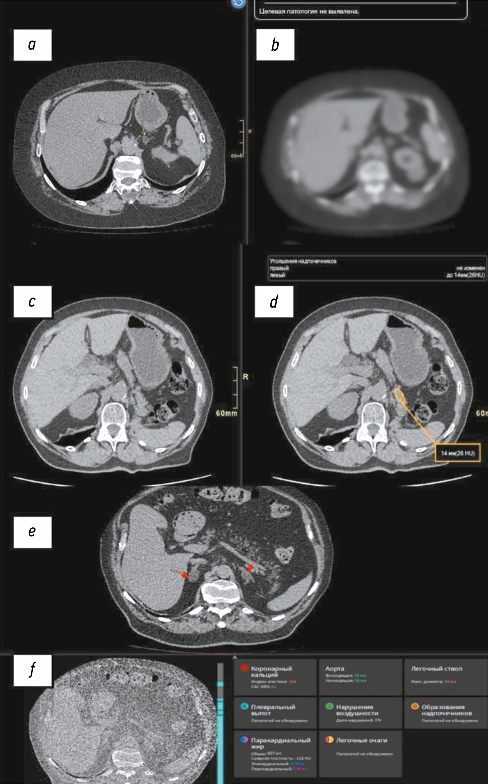 Рис. 4. Примеры некорректного срабатывания сервисов на основе искусственного интеллекта при выявлении новообразований надпочечников: a — пропущенное новообразование надпочечника (жёлтая стрелка); b — пропуск сервисом на основе искусственного интеллекта новообразования левого надпочечника (ложноотрицательный результат); c — результаты компьютерной томографии органов брюшной полости; d — оконтуривание хвоста поджелудочной железы в качестве новообразования надпочечника (ложноположительный результат); e — невыявленные новообразования надпочечников (красные стрелки); f — пропуск комплексным сервисом на основе искусственного интеллекта новообразований надпочечников по данным компьютерной томографии органов грудной клетки в лёгочном режиме (ложноотрицательный результат).