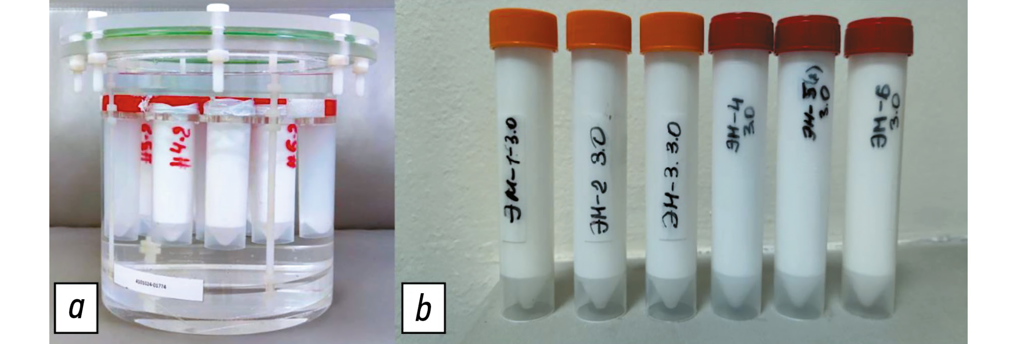 Рис. 1. Фантом: a — внешний вид фантома; b — внешний вид набора пробирок с готовыми эмульсиями.