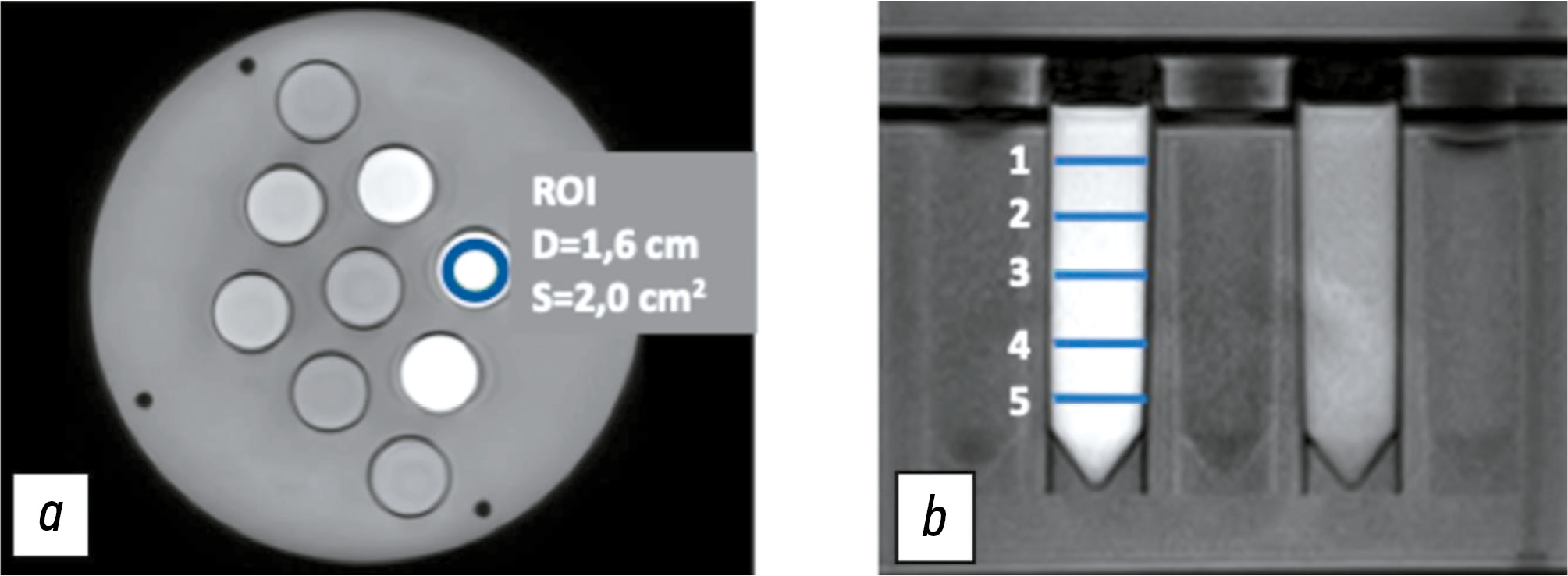 Оценку жировой фракции осуществляли по данным магнитно-резонансных томограмм фантома путём выделения области интереса (Region of Interest, ROI) на соответствующих изображениях (рис. 3, а). Значение интенсивности сигнала внутри области интереса фиксировали на пяти разных срезах (см. рис. 3, b) для серий In, Out, Fat и Water с последующим вычислением средних арифметических значений и внесением их в итоговый протокол результатов теста.
