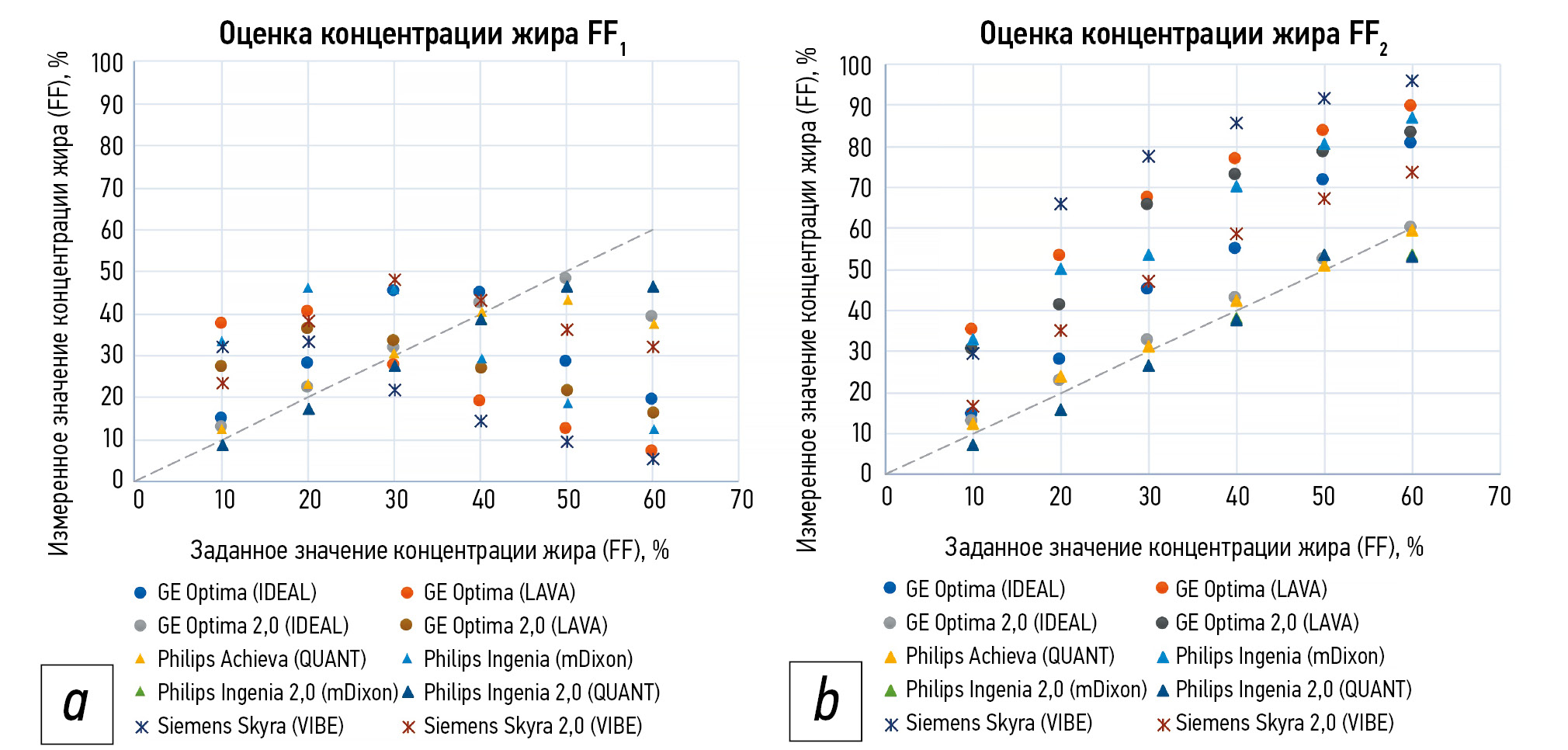 Анализ графиков, построенных для разных томографов и DIXON последовательностей, показал, что при использовании формулы (1) (см. рис. 4, а) все графики измеренных концентраций FF демонстрировали нелинейную зависимость от заданных значений. Для данных, рассчитанных по формуле (2) (см. рис. 4, b), выявлена выраженная линейная зависимость в большинстве случаев измерений, при этом для некоторых показателей наблюдали их смещение вдоль оси y.