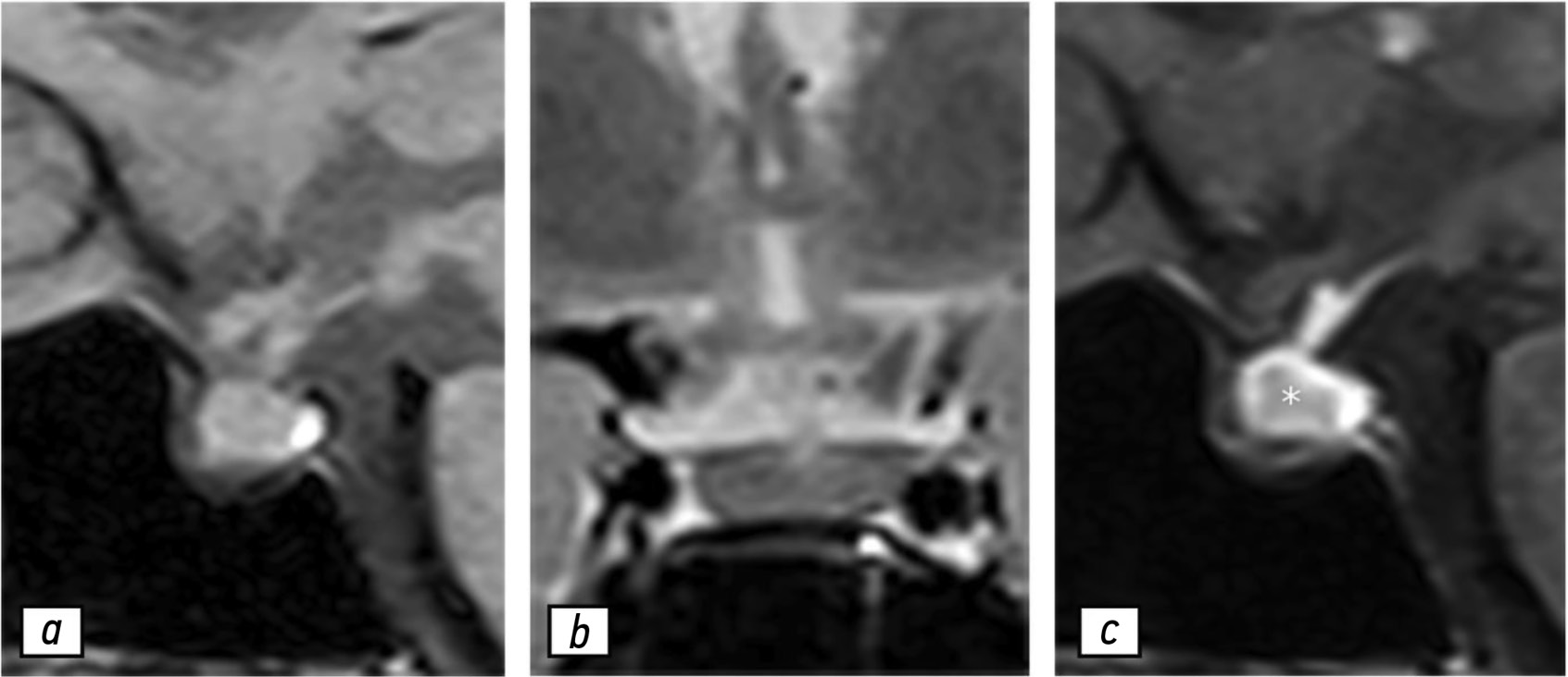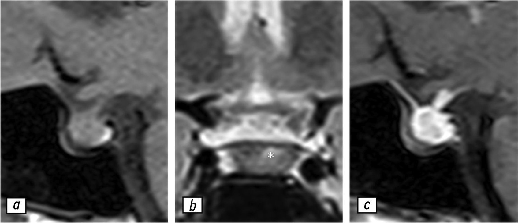 Рис. 2. Результаты магнитно-резонансной томографии гипофиза, 09.07.2021: a — T1-взвешенное изображение в сагиттальной проекции; b — T2-взвешенное изображение в коронарной проекции; с — T1-взвешенное изображение в сагиттальной проекции с контрастированием. Отмечено умеренное увеличение гипофиза, усиление сигнала в его веществе (звёздочка) на T2-взвешенных изображениях (b), а также гетерогенное накопление контрастного вещества в центральной области гипофиза.