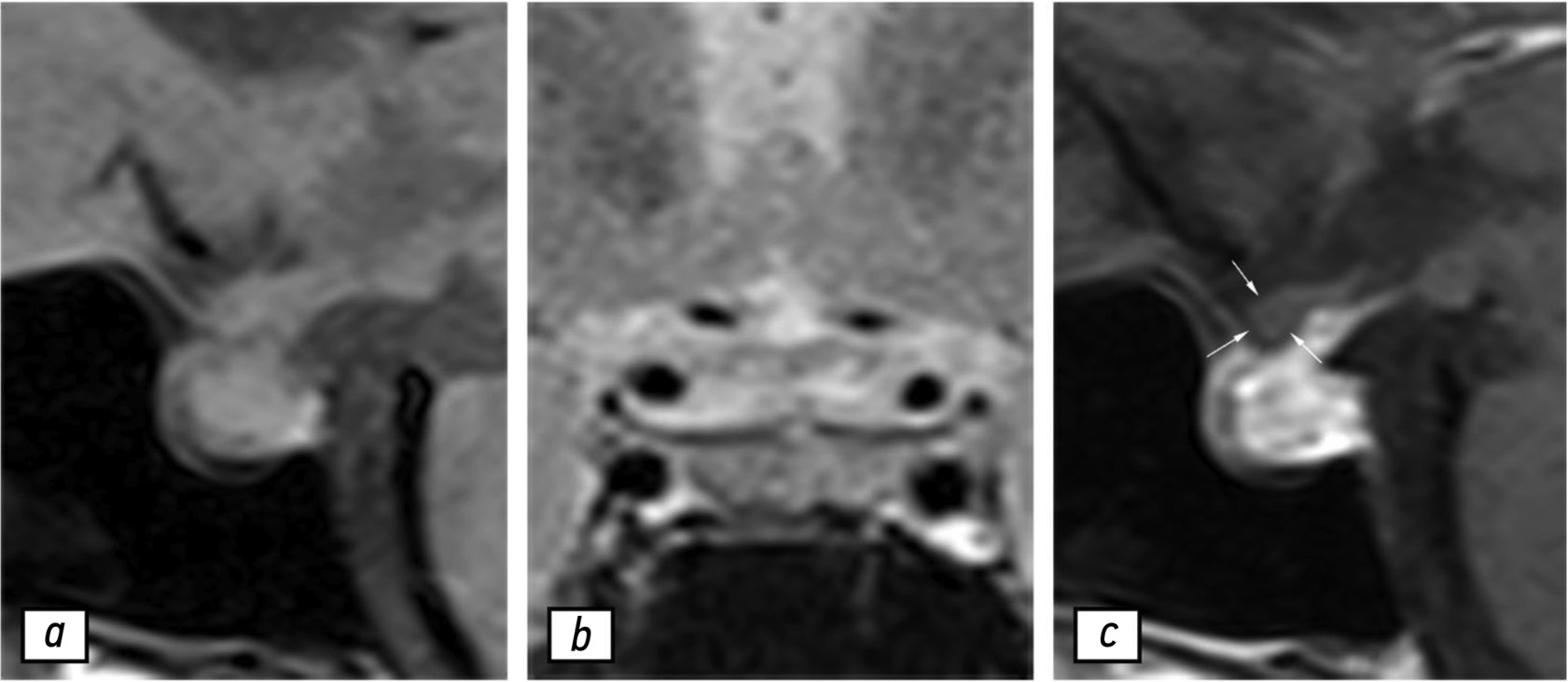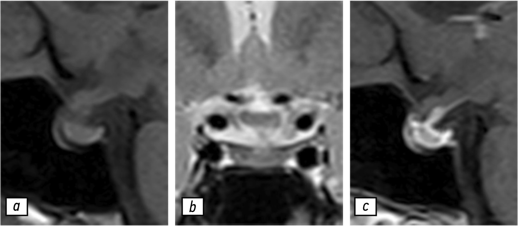 Рис. 5. Результаты магнитно-резонансной томографии гипофиза, 03.10.2022: a — T1-взвешенное изображение в сагиттальной проекции; b — T2-взвешенное изображение в коронарной проекции; с — T1-взвешенное изображение в сагиттальной проекции с контрастированием. Гипофиз не увеличен, в центральных отделах наблюдается гетерогенное накопление контрастного вещества. Хиазма утолщена и имеет умеренно гетерогенную структуру. Отмечены положительные изменения по сравнению с предыдущими данными магнитно-резонансной томографии.