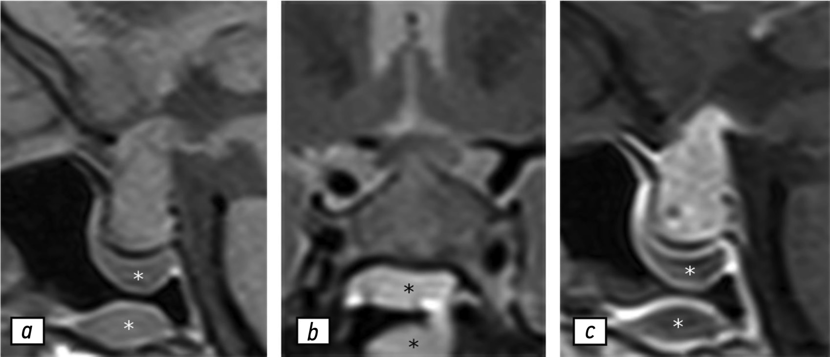 Рис. 1. Результаты магнитно-резонансной томографии гипофиза, 02.05.2020: a — T1-взвешенное изображение в сагиттальной проекции; b — T2-взвешенное изображение в коронарной проекции; с — T1-взвешенное изображение в сагиттальной проекции с контрастированием. Гипофиз (звёздочка) не увеличен и имеет слегка гетерогенную структуру.