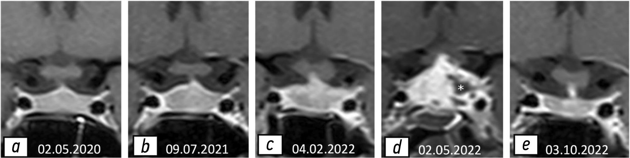 Рис. 6. T1-взвешенные изображения гипофиза в коронарной проекции с контрастированием: a — нормальные размеры и слегка гетерогенная структура; b, c — постепенное увеличение гипофиза в течение 21 месяца; d — выраженное увеличение гипофиза в течение трёх месяцев, наличие неконтрастной области, вероятно, вследствие некроза (звёздочка); e — гипофиз не увеличен, отмечена положительная динамика.