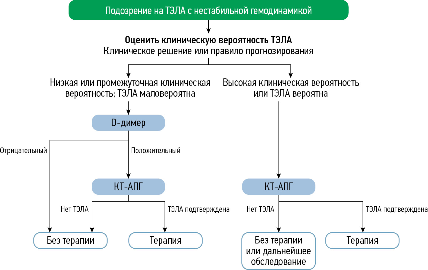 Рис. 2. Диагностический алгоритм для пациентов с подозрением на тромбоэмболию лёгочной артерии высокого риска без признаков нестабильной гемодинамики. ТЭЛА — тромбоэмболия лёгочной артерии; КТ-АПГ — компьютерно-томографическая ангиопульмонография. Адаптировано из [12]. Публикуется с разрешения правообладателя.