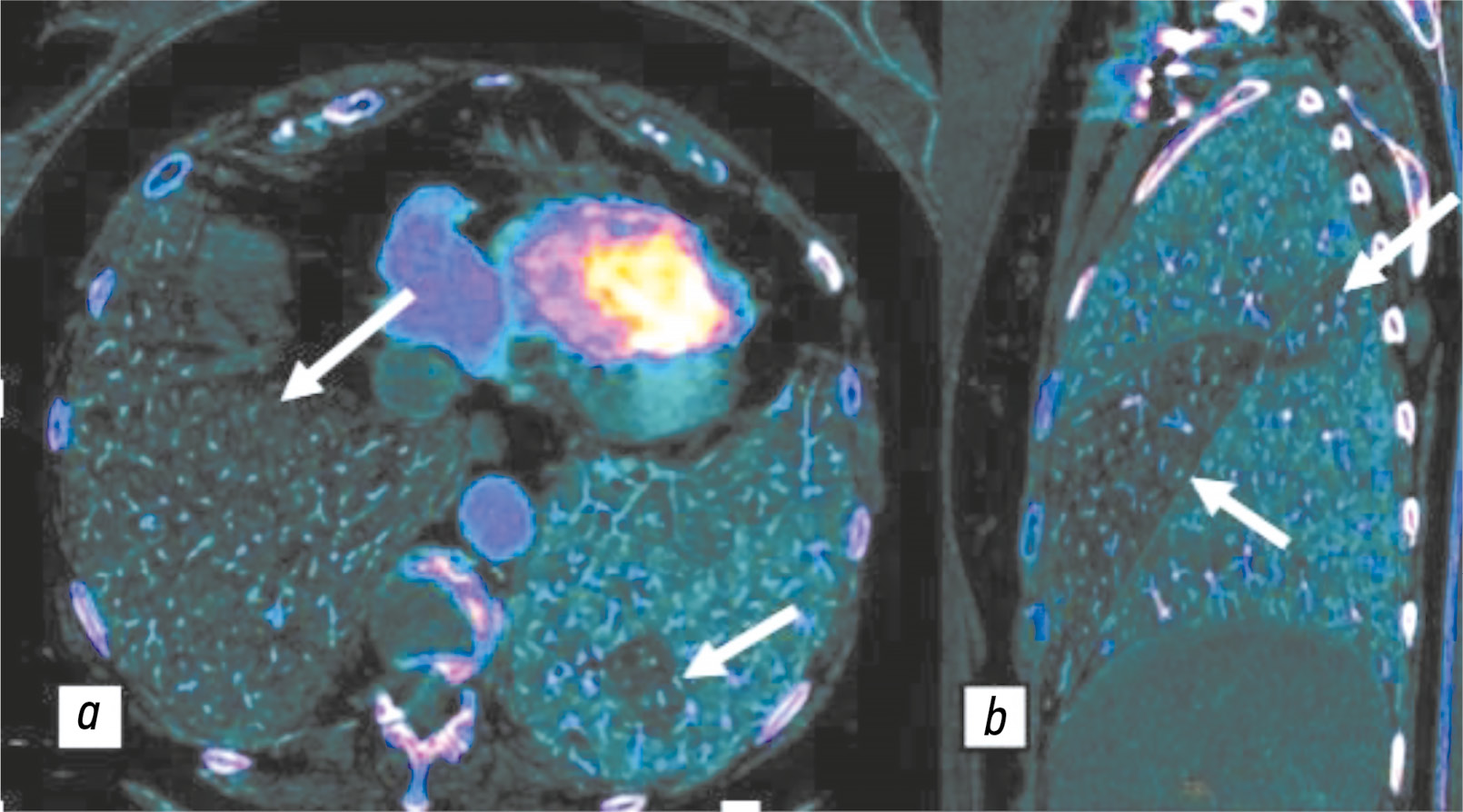 Рис. 3. Цветные йодные карты перфузии, полученные с помощью двухэнергетической компьютерно-томографической ангиопульмонографии: a — дефекты перфузии нижней доли справа, локальный дефект перфузии нижней доли слева (белые стрелки); b — дефект перфузии средней доли, участок гипоперфузии S2 и S6 (белые стрелки). Публикуется с разрешения правообладателя. © ФГАУ «Лечебно-реабилитационный центр», 2018.