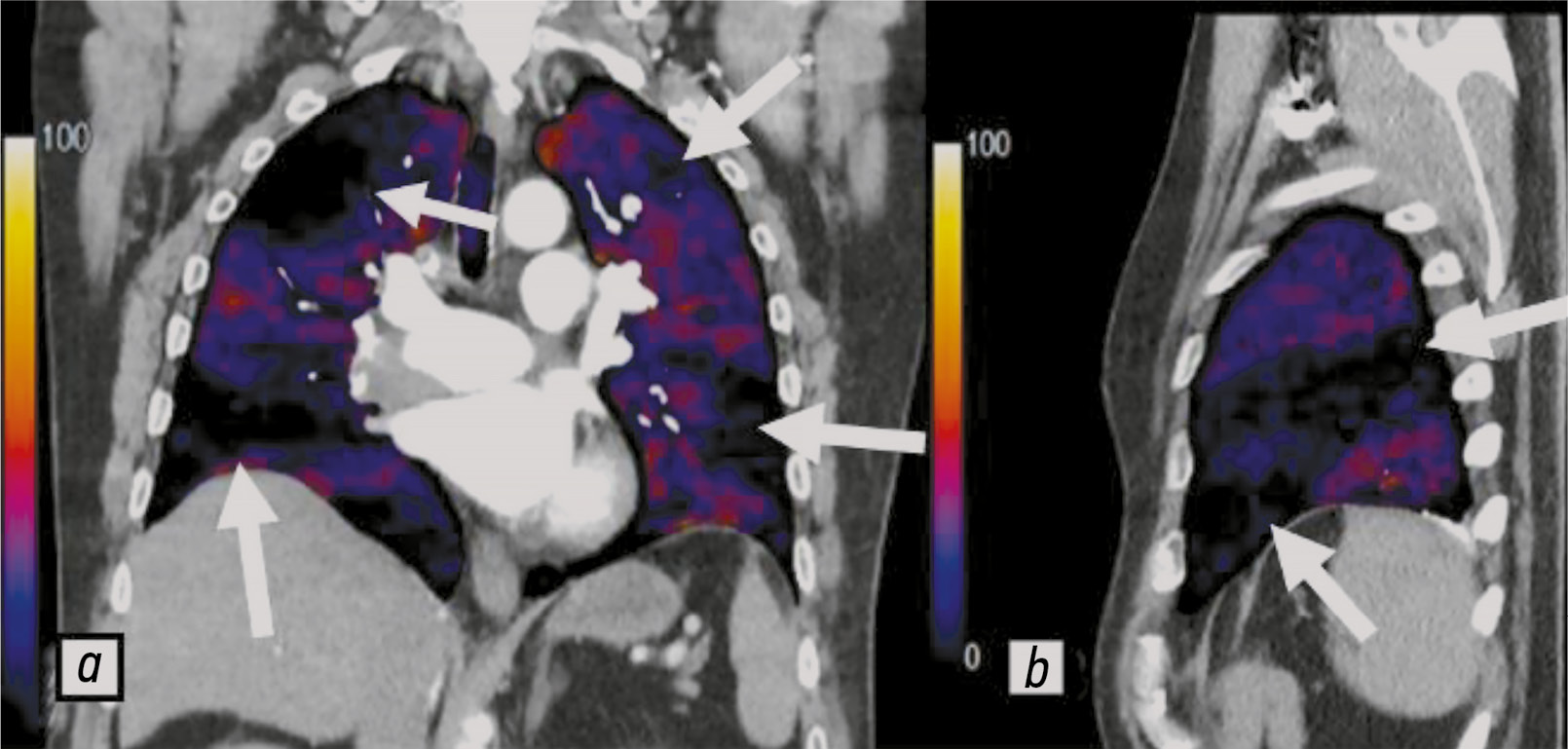 Рис. 4. Перфузионные йодные карты, полученные с помощью субтракционной компьютерно-томографической ангиопульмонографии: a — клиновидные дефекты перфузии во фронтальной проекции (белые стрелки); b — клиновидный дефект перфузии в сагиттальной проекции (белые стрелки). Публикуется с разрешения правообладателя. © ФГАУ «Лечебно-реабилитационный центр», 2018.