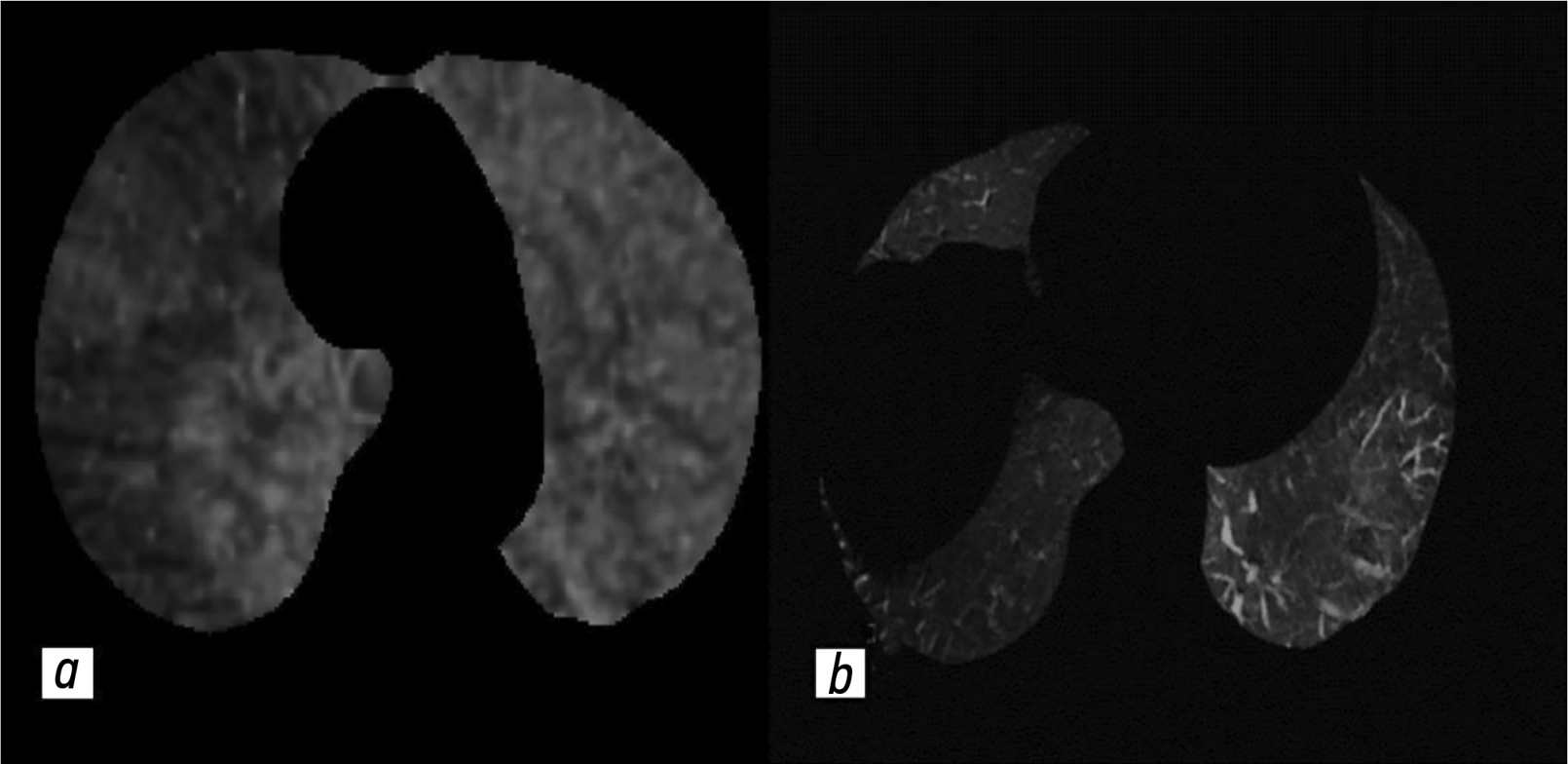 Рис. 5. Субтракционные изображения паренхимы и сосудов: a — тёмный участок в правом лёгком, визуализируемый в режиме Sub-Lung, соответствует пониженной перфузии в лёгких; b — нитевидные лёгочные артерии, визуализируемые в режиме Sub-VSL. Публикуется с разрешения правообладателя. © ФГАУ «Лечебно-реабилитационный центр», 2018.