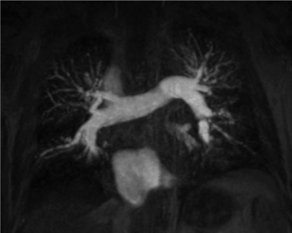 Рис. 6. Результаты магнитно-резонансной ангио-пульмонографии: на изображении во фронтальной проекции определяются расширенные и деформированные лёгочные артерии с пристеночными дефектами контрастирования. Публикуется с разрешения правообладателя. © ФГАУ «Лечебно-реабилитационный центр», 2018.