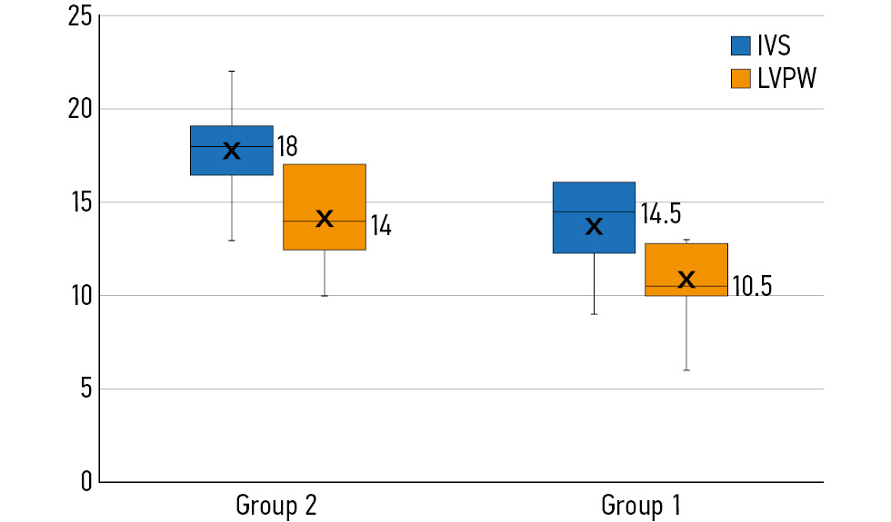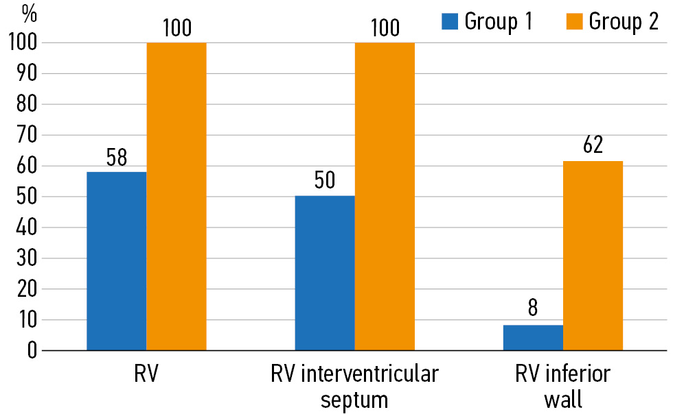 RESULTS: Group 2 showed a more significant thickening of the myocardial walls compared to group 1 (interventricular septum: 18 [17; 18] vs. 14.5 mm [12.8; 16.0], p <0.01, posterior wall of the left ventricle: 14 [13; 17] vs. 10.5 mm [10; 12.3], p <0.01). The indexed mass of the left ventricle myocardium was 110 [92; 125] in group 2 and 85 mm [69.3; 91.8] in group 1 (p <0.01). In group 2, late gadolinium enhancement with a transmural left ventricle pattern was more frequently observed in the basal and mid-lower-lateral segments, whereas in group 1, a subendocardial pattern of late gadolinium enhancement was more frequent in the mid-anterior and lower-lateral segments (p <0.05). In addition, frequency of simultaneous contrast enhancement in the subendocardial layers of the interventricular septum on the left ventricle and right ventricle sides was higher in group 2 (100% of cases vs. 50%, p <0.01). Late gadolinium enhancement of the right ventricle was also more common in group 2 (100 vs. 58%, p <0.05), especially in the interventricular septum and inferior wall area (p <0.05). Semi-quantitative assessment of LGE using the Query Amyloid Late Enhancement (QALE) showed greater contrast enhancement in group 2: 13 [12; 14] vs. 10.5 [1.75; 12], p <0.01), and a score greater than 13 differentiated between cardiomyopathy due to AL amyloidosis and ATTR amyloidosis with a sensitivity of 69% and a specificity of 83%.