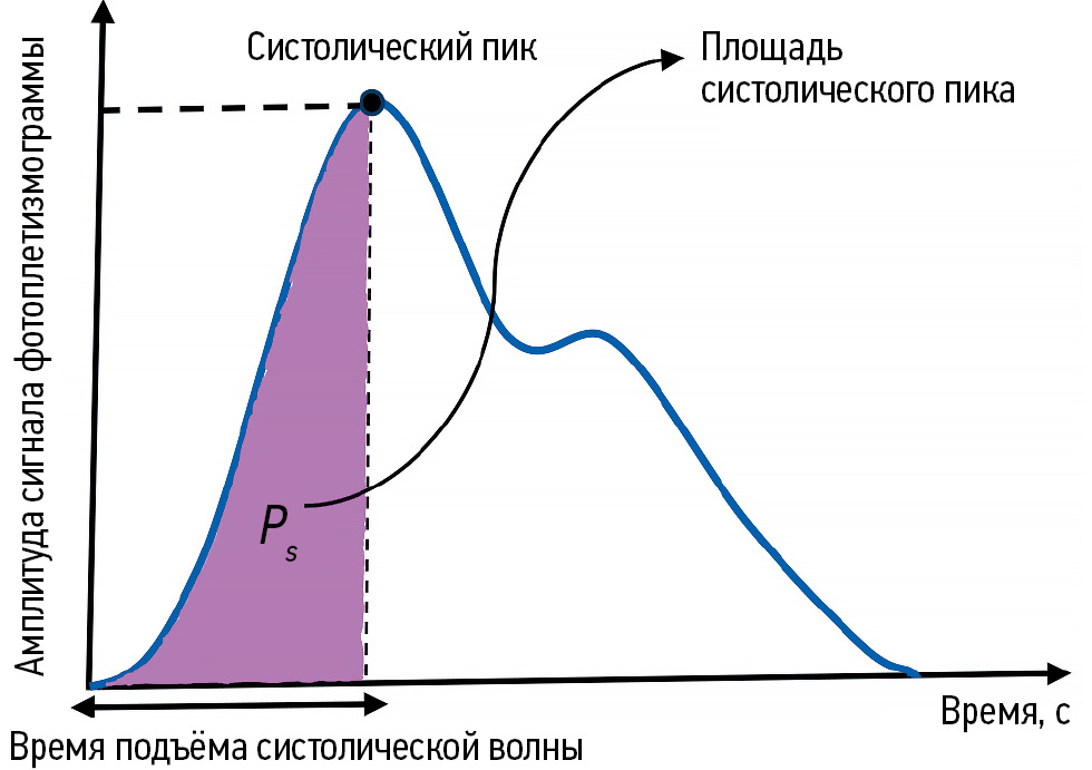 Амплитуда систолической волны, систолический пик и время подъёма систолической волны — это последовательные фазы сердечного цикла с подтверждённой диагностической и прогностической ценностью при оценке общей функции сердца [22, 23, 27]. Соответственно, в настоящем исследовании оценивали систолический индекс площади, отражающий характеристики, описанные выше. На рис. 1 представлен сигнал фотоплетизмограммы с указанием систолического пика и времени подъёма систолической волны, кроме того, отмечена площадь систолического пика (Ps).