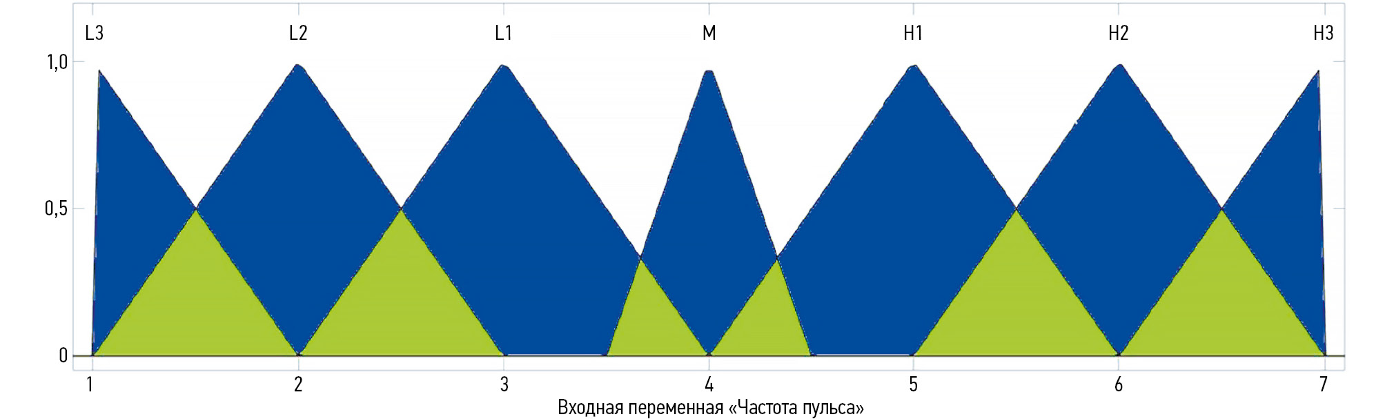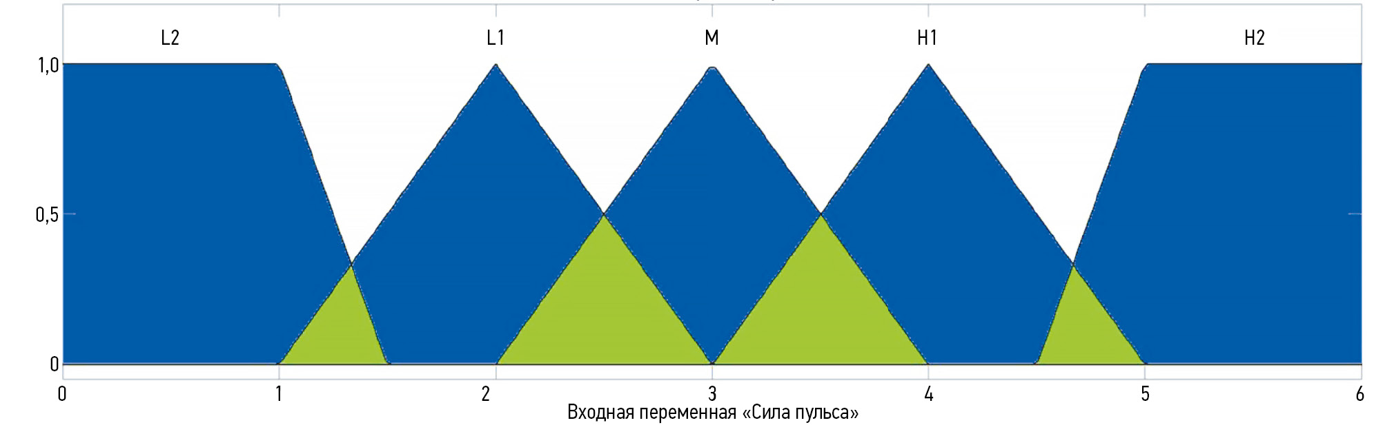 Входные переменные (частоту и силу пульса) анализировали с использованием треугольных функций принадлежности (рис. 2 и 3).