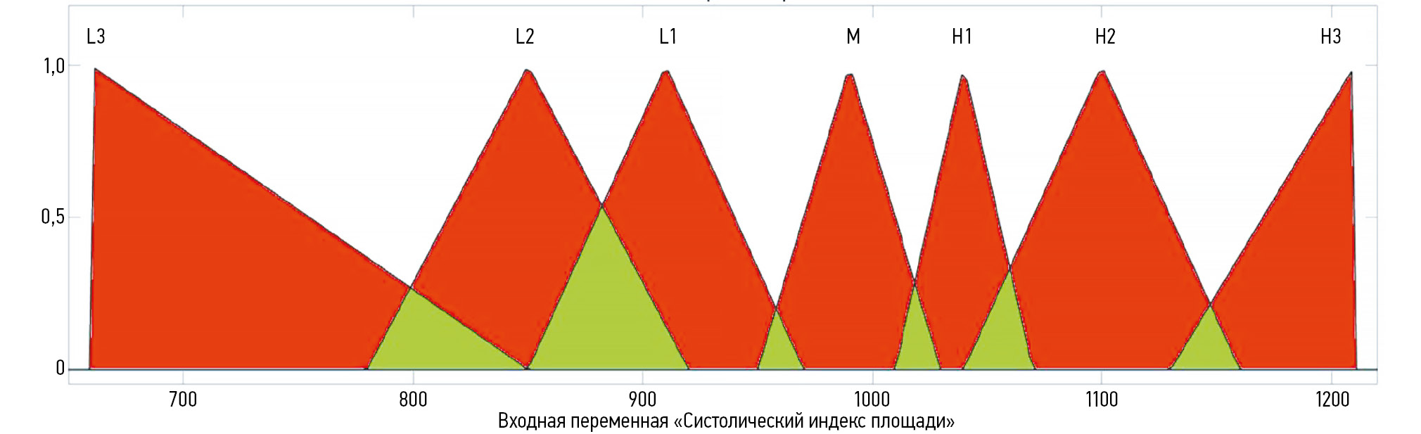 Кроме того, выходную переменную (систолический индекс площади) определяли с использованием треугольных функций принадлежности (рис. 4).