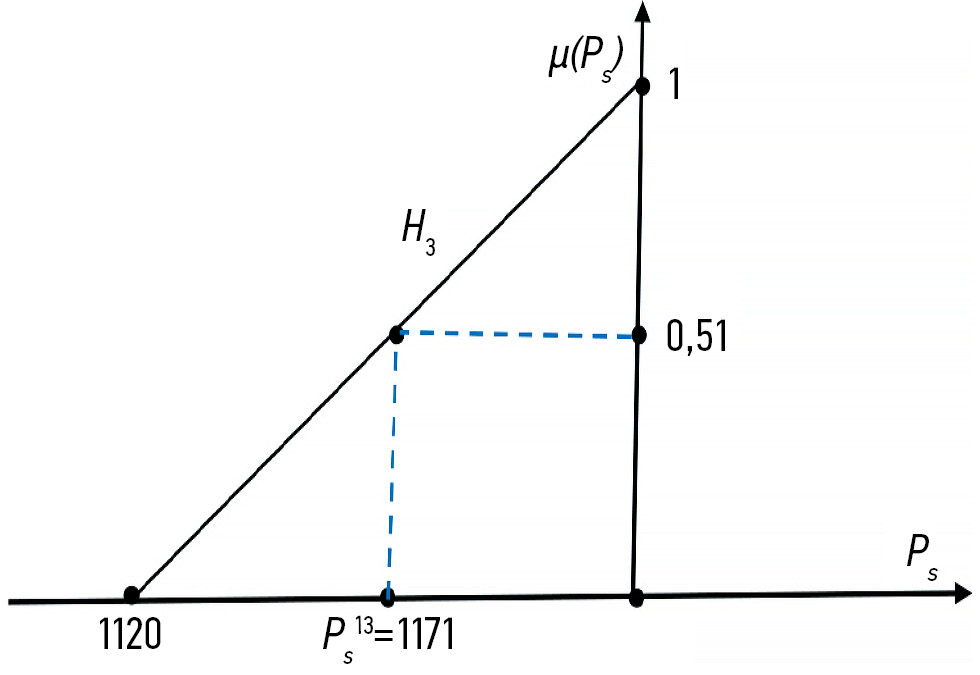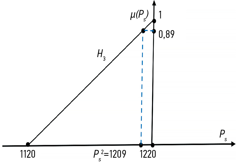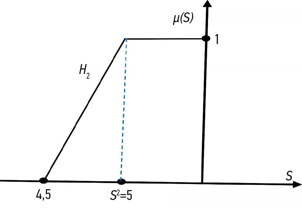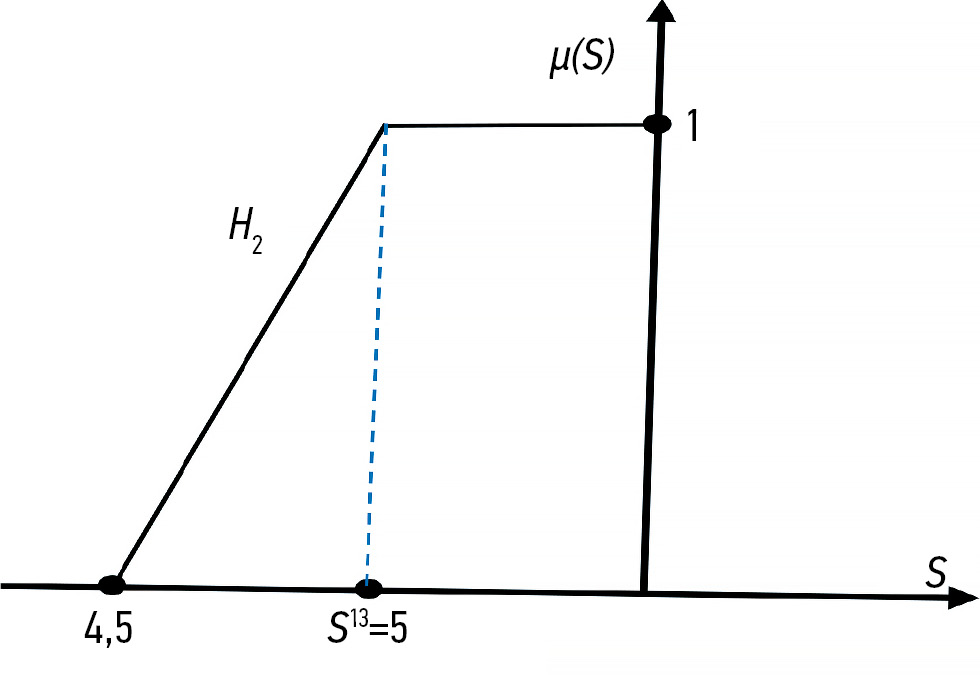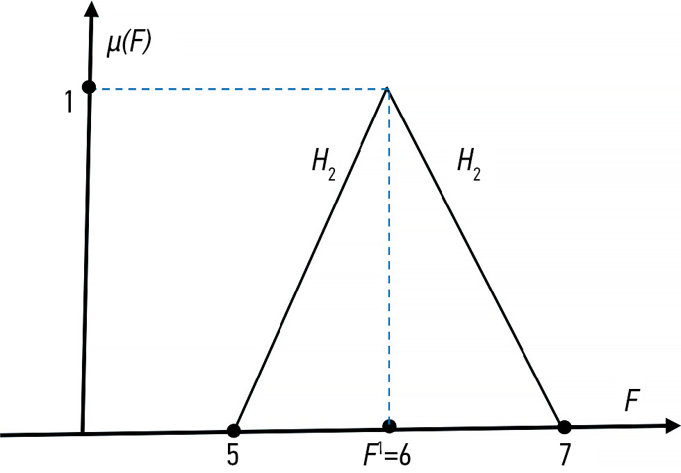С использованием данных табл. 2 оценивают первую пару входных и выходных переменных (F1, S1; Ps1)=(6, 1, 660). Согласно функциям принадлежности (см. рис. 2), для F1=6 (рис. 5) значение функции принадлежности составляет 1 в нечётком множестве H2; в других нечётких множествах значение функции принадлежности составляет 0: