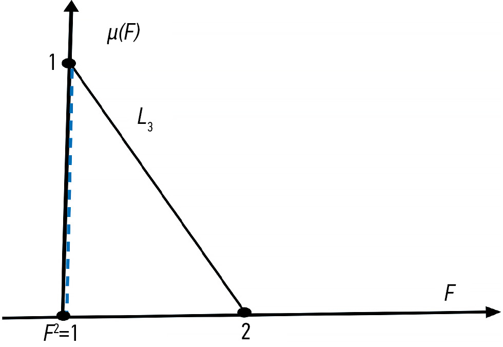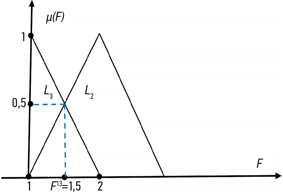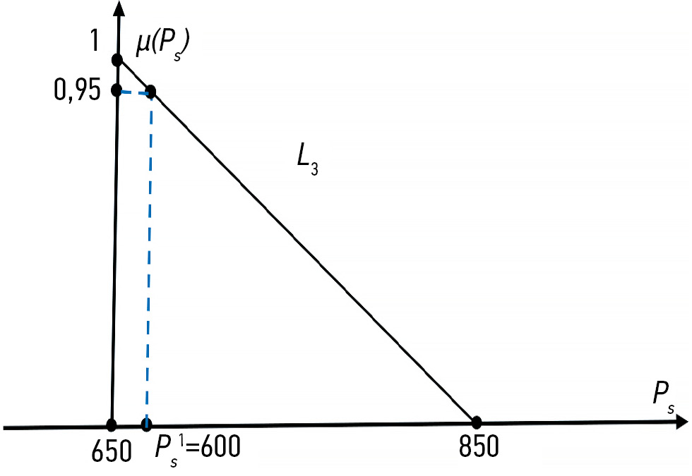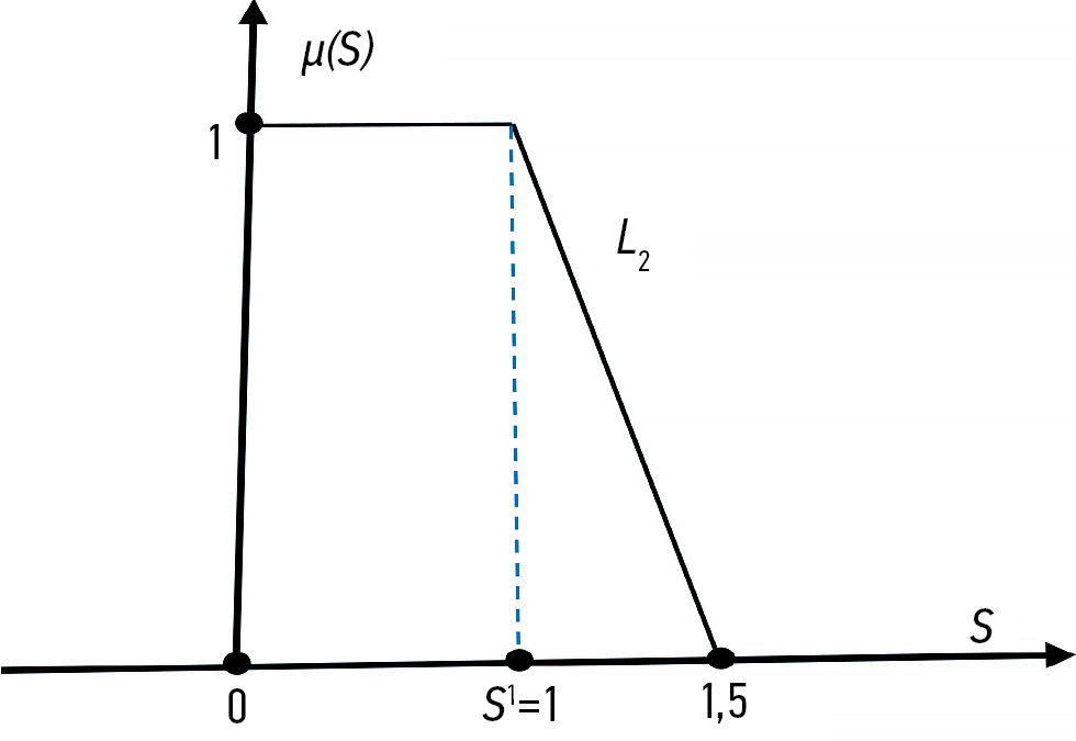 Таким образом, согласно функциям принадлежности (см. рис. 3), для S1=1 (рис. 6) значение составляет 1 в нечётком множестве L2: