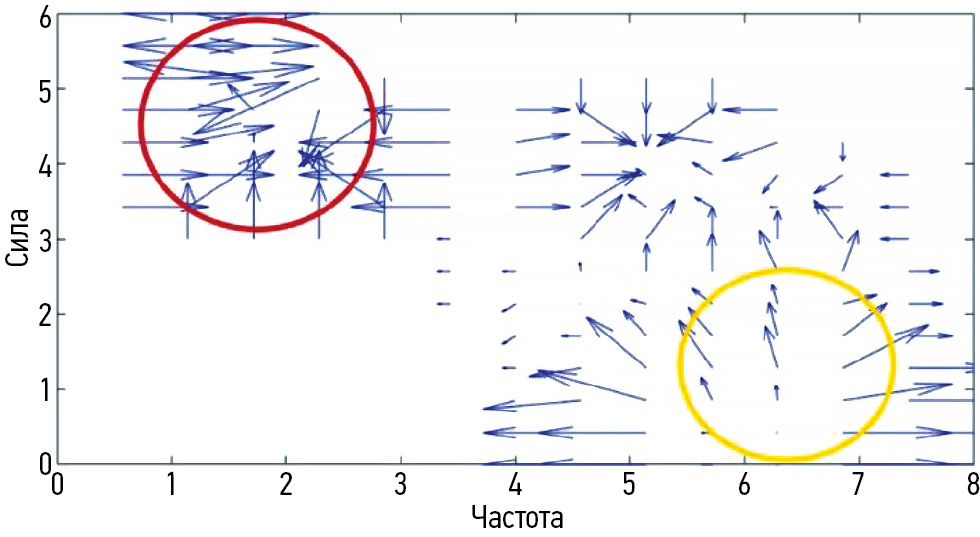 Область с максимальными значениями систолического индекса площади обозначена красным цветом, а область с минимальными значениями — жёлтым цветом. Область, обозначенная красным цветом (см. рис. 14), соответствует правилам, где повышение силы и частоты пульса приблизительно в 4–5 и 1–2 раза соответственно приводит к увеличению систолического индекса площади. Напротив, область, обозначенная жёлтым цветом (см. рис. 14), соответствует правилам, где снижение силы и частоты пульса приблизительно в 1–2 и 6–7 раз соответственно приводит к уменьшению систолического индекса площади.
