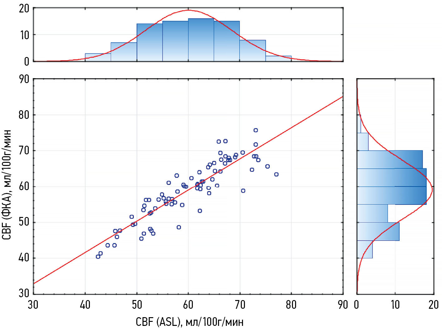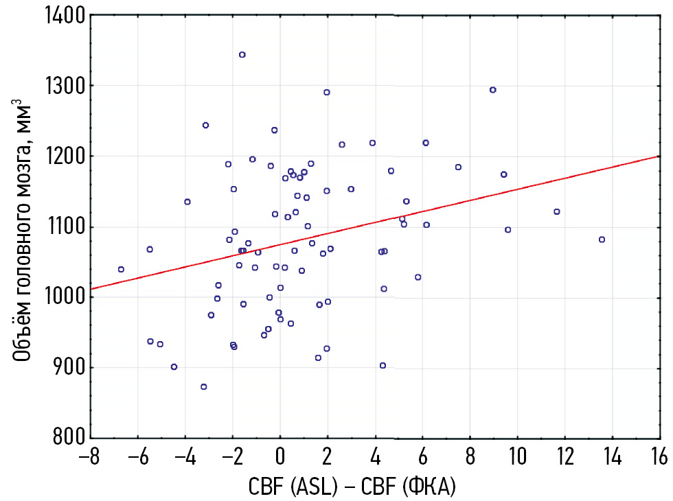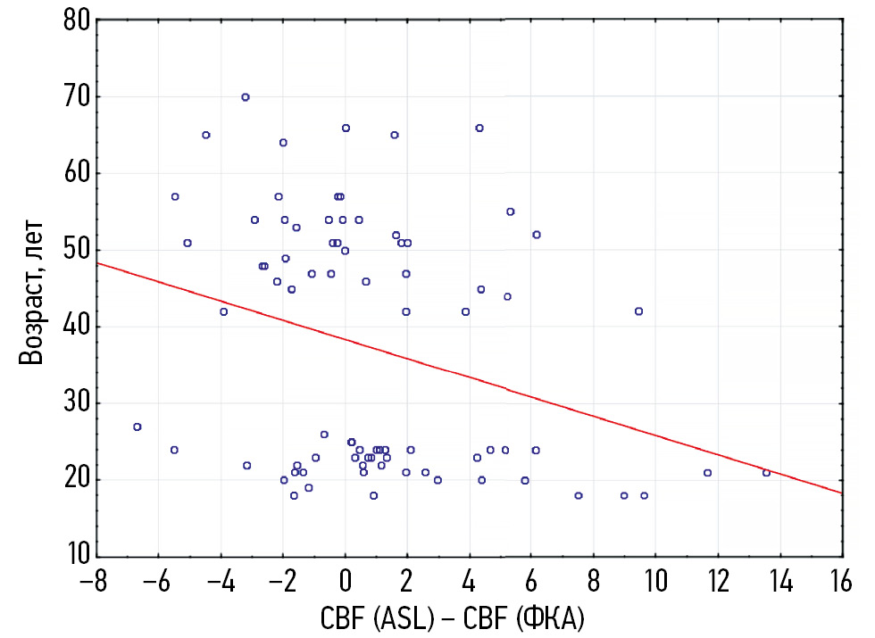 Методы статистического анализа данных. Анализ данных выполнен с использованием пакета статистических программ STATISTICA®, версия 10.0 (StatSoft Inc., Соединённые Штаты Америки). Характер распределения значений количественных показателей определяли с помощью критерия Колмогорова–Смирнова и Шапиро–Уилка (по двум критериям соответственно — pCASL: p >0,2; ФКА: p >0,2), а также построением нормальных вероятностных графиков (значения располагались вдоль теоретической нормальной прямой) и гистограмм. Результаты представлены в виде M±SD, где M — среднее арифметическое, SD — стандартное отклонение. Для сравнения количественных показателей в группах применяли t-критерий Стьюдента для парных (связанных) групп, для анализа связей — корреляционный анализ с расчётом коэффициента корреляции Пирсона (r). Для анализа чувствительности и оценки ассоциации факторов пол, возраст и объём мозга (независимые переменные) с разницей значений церебральной перфузии CBF-ASL и CBF-ФКА (зависимая переменная) использовали метод многофакторной линейной регрессии. Статистически значимыми считали различия и связи при p <0,05.