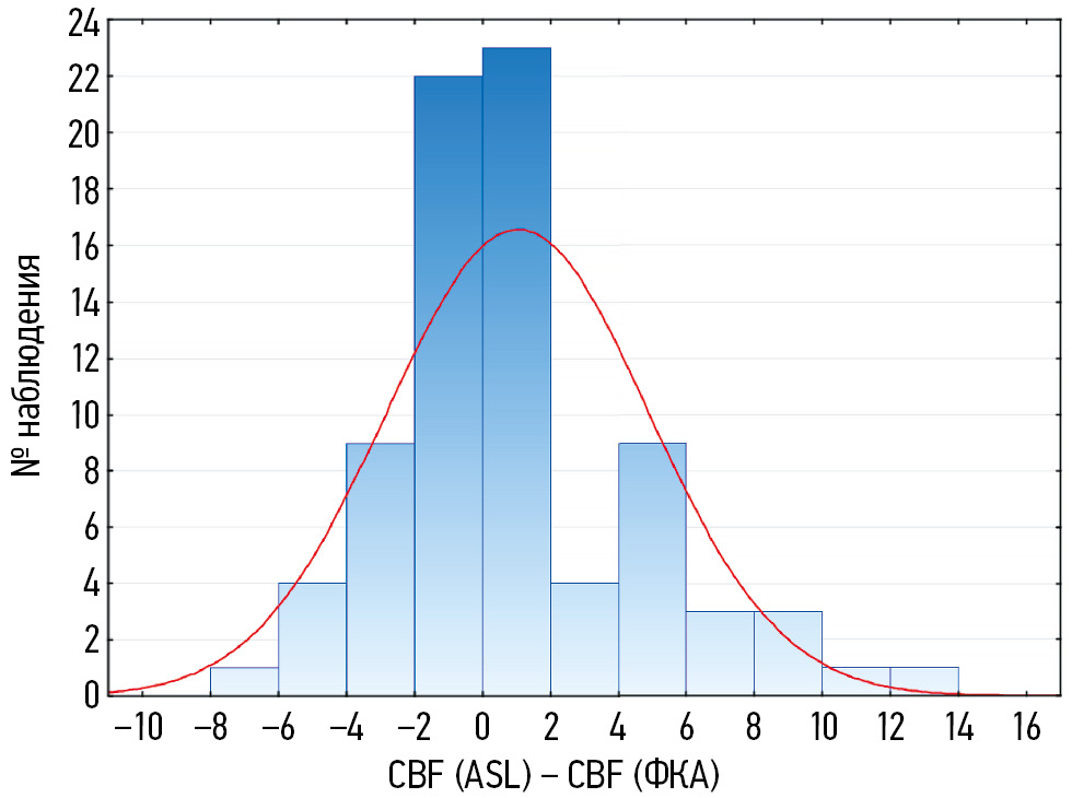Рис. 2. Распределение разности значений церебральной перфузии по данным бесконтрастной перфузионной магнитно-резонансной томографии и фазово-контрастной ангиографии. ФКА — фазово-контрастная ангиография; ASL (Arterial Spin Labeling) — маркирование артериальных спинов; CBF (Cerebral Blood Flow) — общая церебральная перфузия.